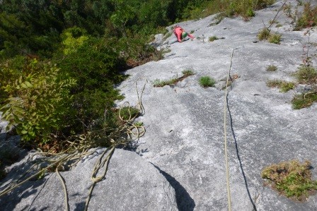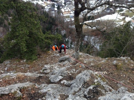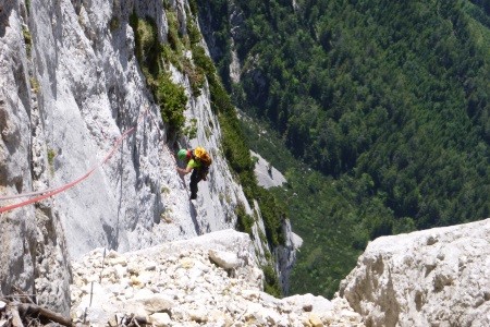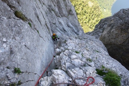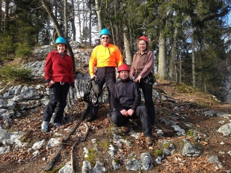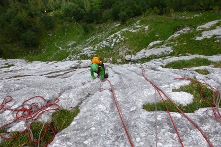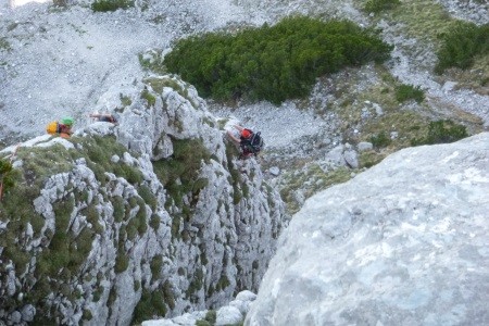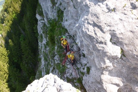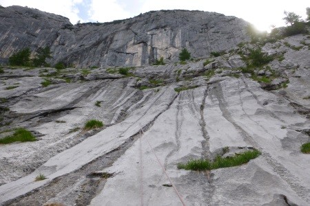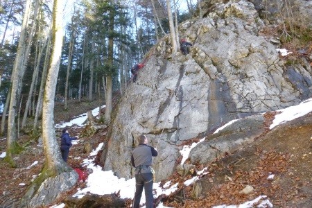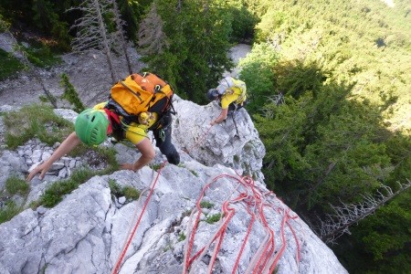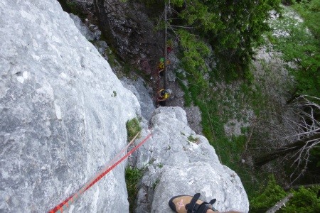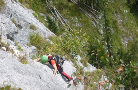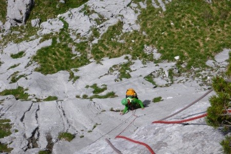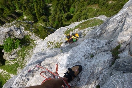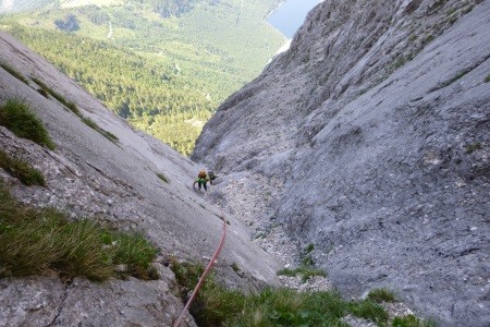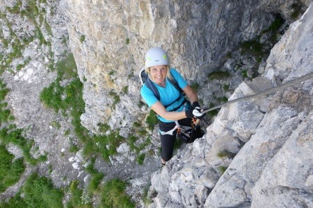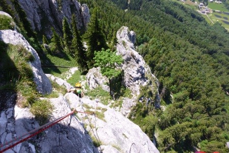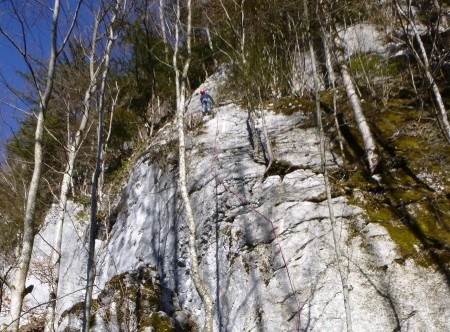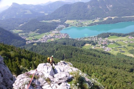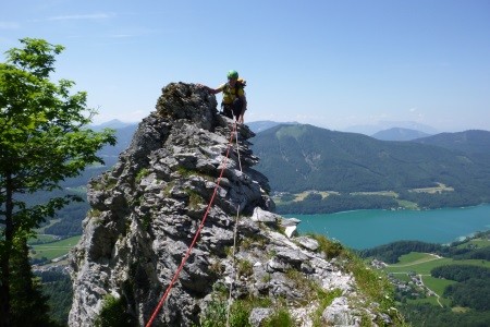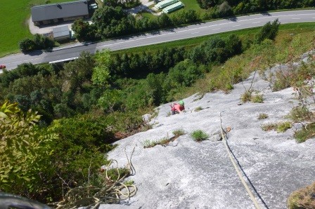 Genusskletterei mit luftigen Stellen, zwei Abseilstellen und ein A0 Ausstiegsüberhang in einer landschaftlich sehr reizvollen Gegend.
