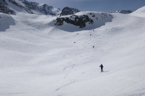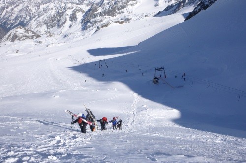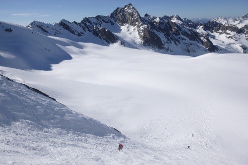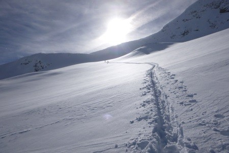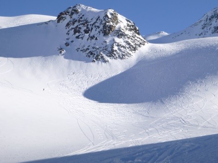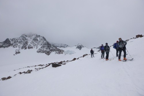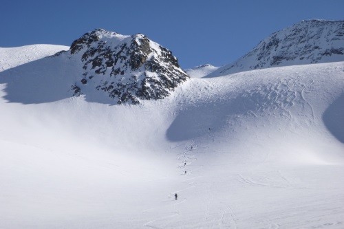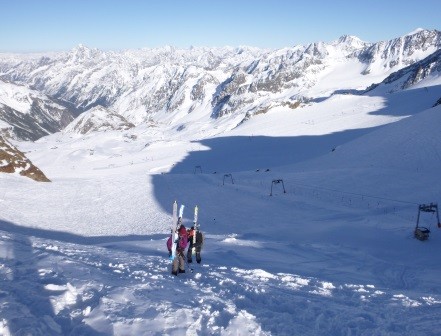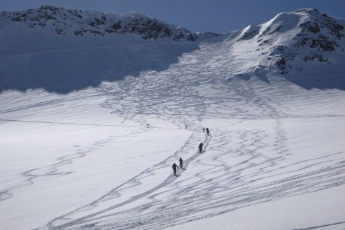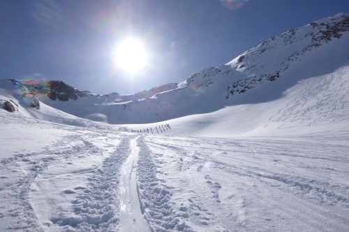 Vom Gletscherschigebiet Stubai mit Liftunterstützung zum Daunjoch 3.057 m - 800 Hm unverspurte Pulverschneeabfahrt über Sulztalferner - 900 Hm Aufstieg zum Kuhscheibenspitz - 3.189 m - Abfahrt und Nächtigung Amberger Hütte - 2.135 m - über Daunjoch ( optional Hinterer Daunkopf/3.225 m) wieder zurück ins Gletscherschigebiet