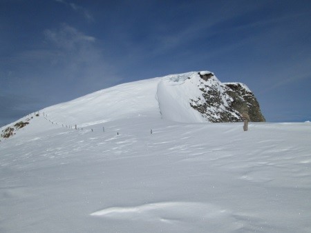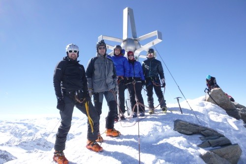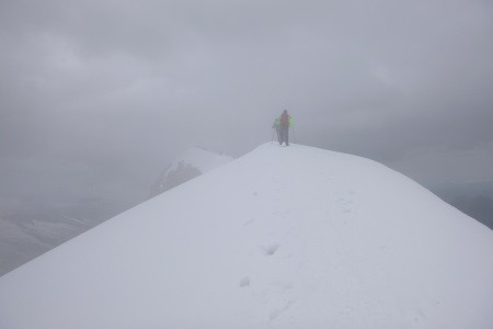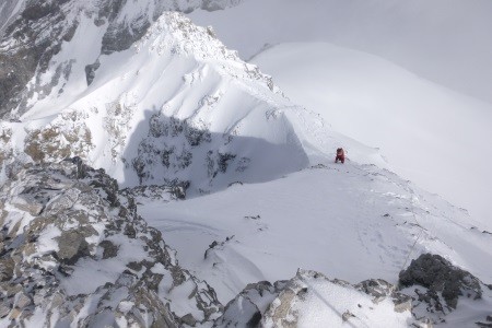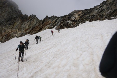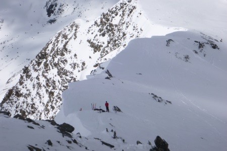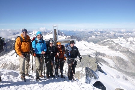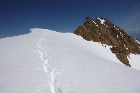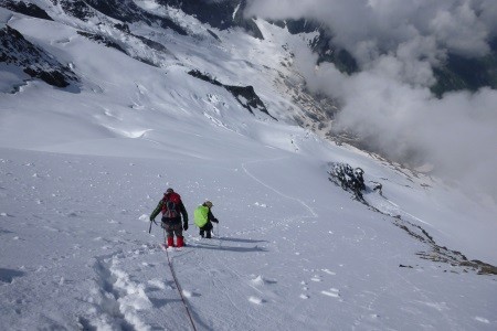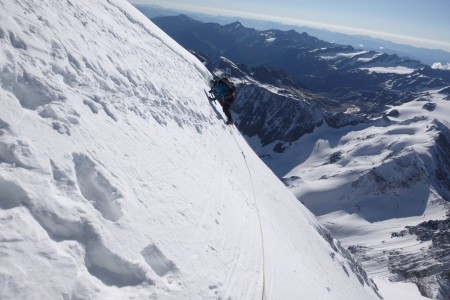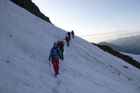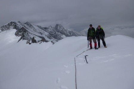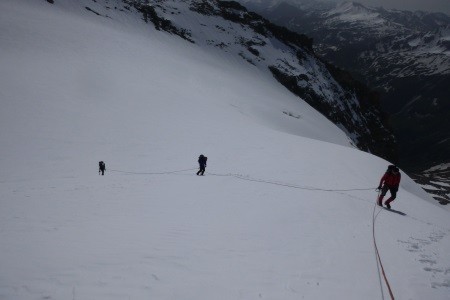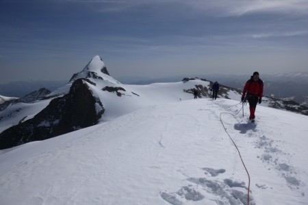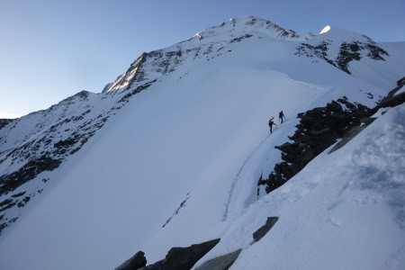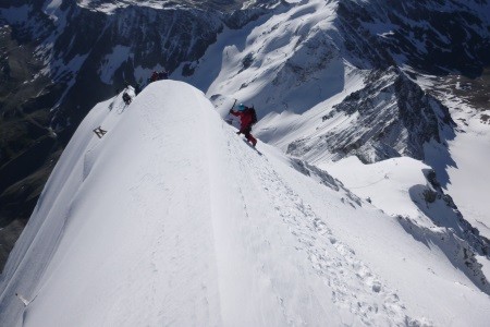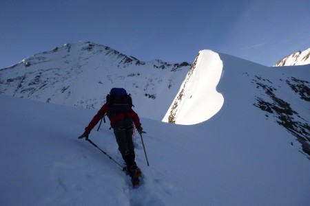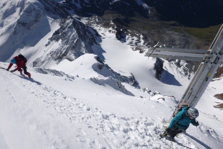 Am nächsten Morgen über eine 45 Grad steile Schneerinne auf das Königsjoch (3.462 m) und weiter über die 40 Grad steile Ostflanke zum luftigen Firngrat auf den Gipfel der Königsspitze.