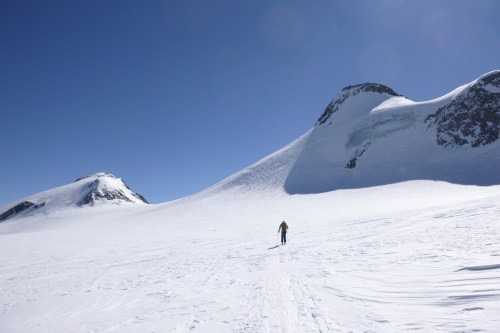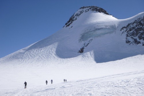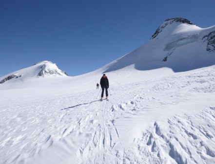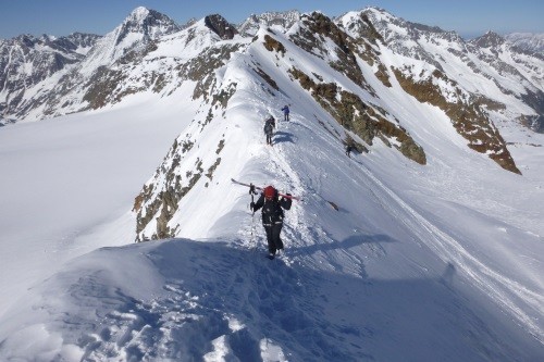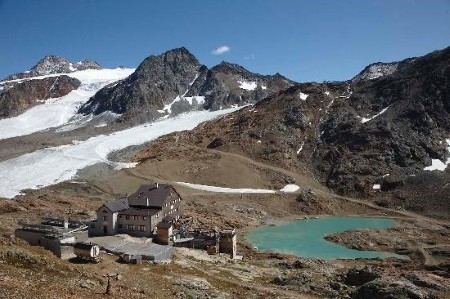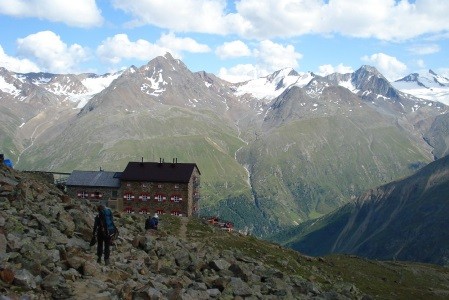 Weiter über Kesselwandferner auf den Fluchtkogel (3.500 m) und Abstieg über Oberes Guslarjoch zur Vernagthütte und über Seufertweg zur Breslauer Hütte ( 2.844 m)