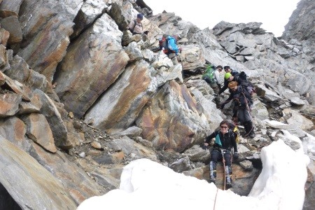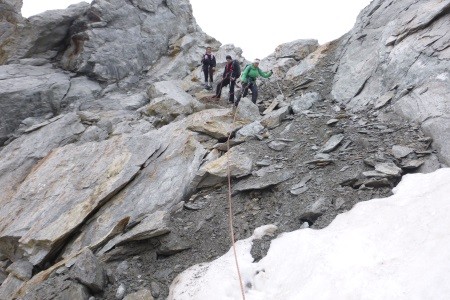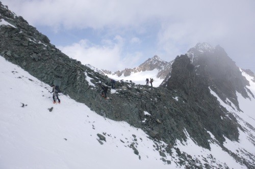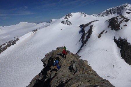 Abstieg über Nordwestgrat zur Silvrettalücke 3.140m und weiter ansteigen über den Felsaufbau zur Schneeglocke.