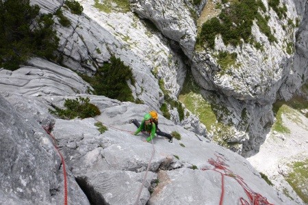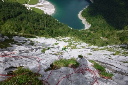 Feinste Wasserrillenkletterei hoch über dem hinteren Gosausee auf bestem Dachsteinkalk,