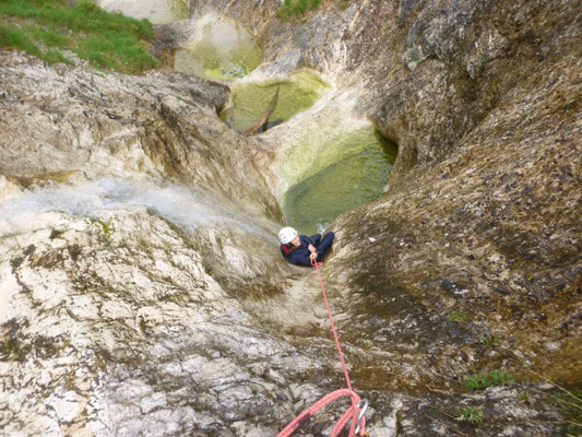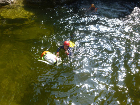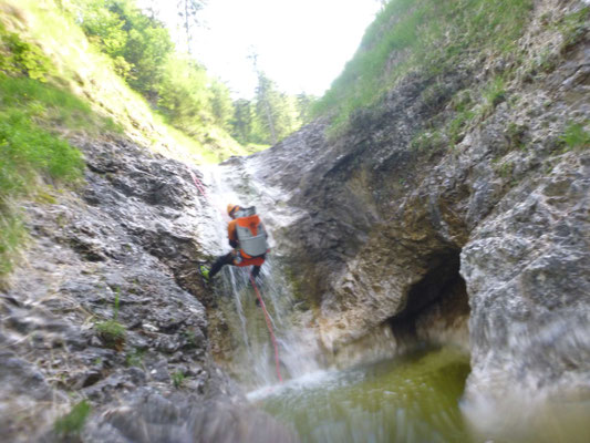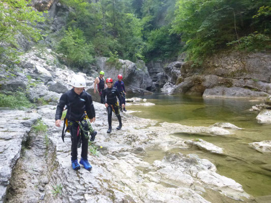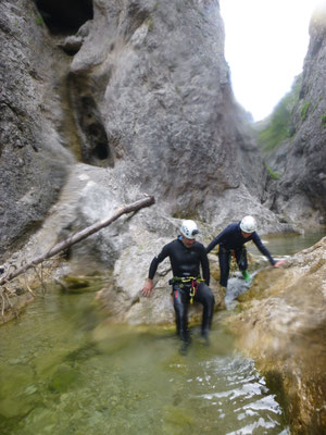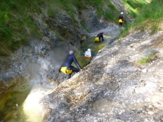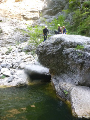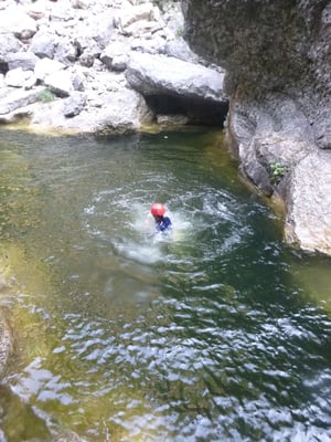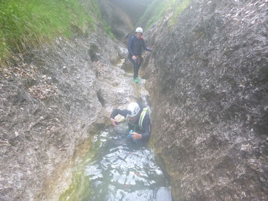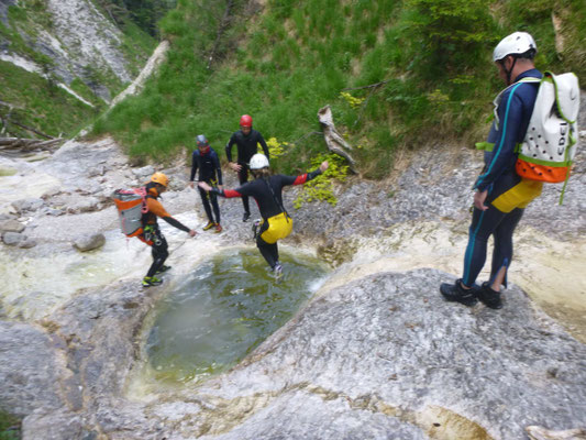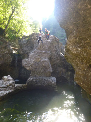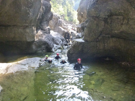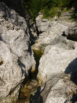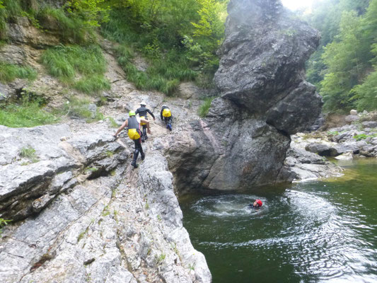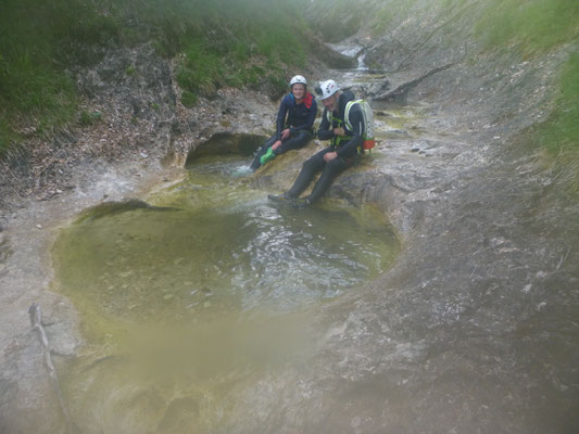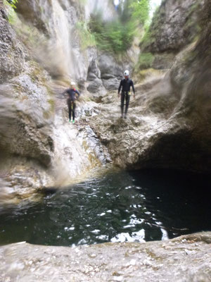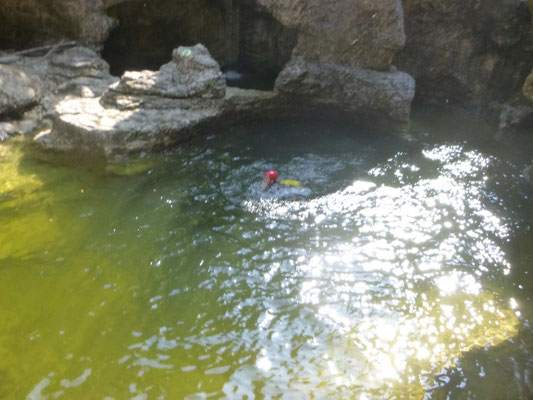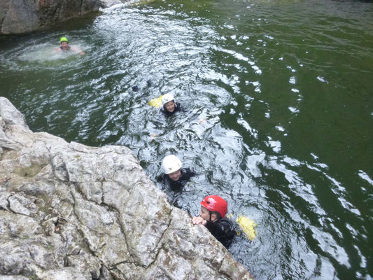 Zahlreiche Sprünge ( die man umgehen kann), kurze Schwimmstrecken, lustige Rutschen …..