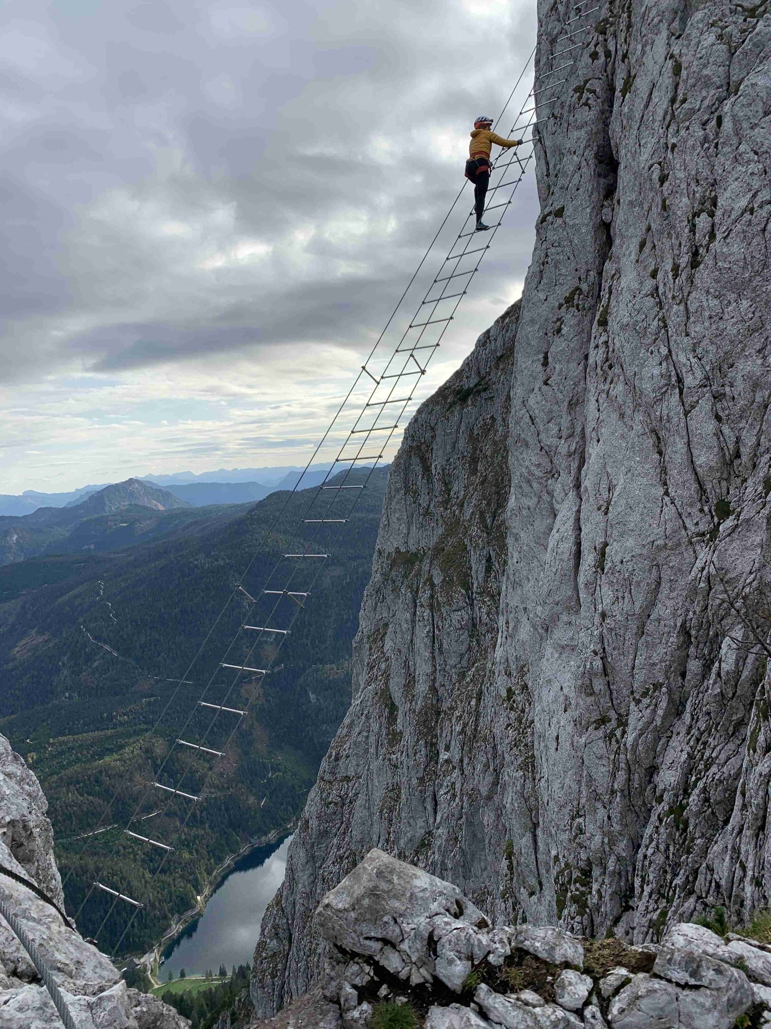 Erleben Sie den Donnerkogel Klettersteig „Himmelsleiter“ am Dachstein – ein Klassiker für Klettersteigfans! Highlight der Tour ist die 40-Meter-Riesenleiter, die eine tiefe Schlucht überquert. Auf vier abwechslungsreichen Etappen klettern Sie am Intersport Klettersteig auf den Großen Donnerkogel und genießen einen spektakulären Blick auf den Dachstein.
