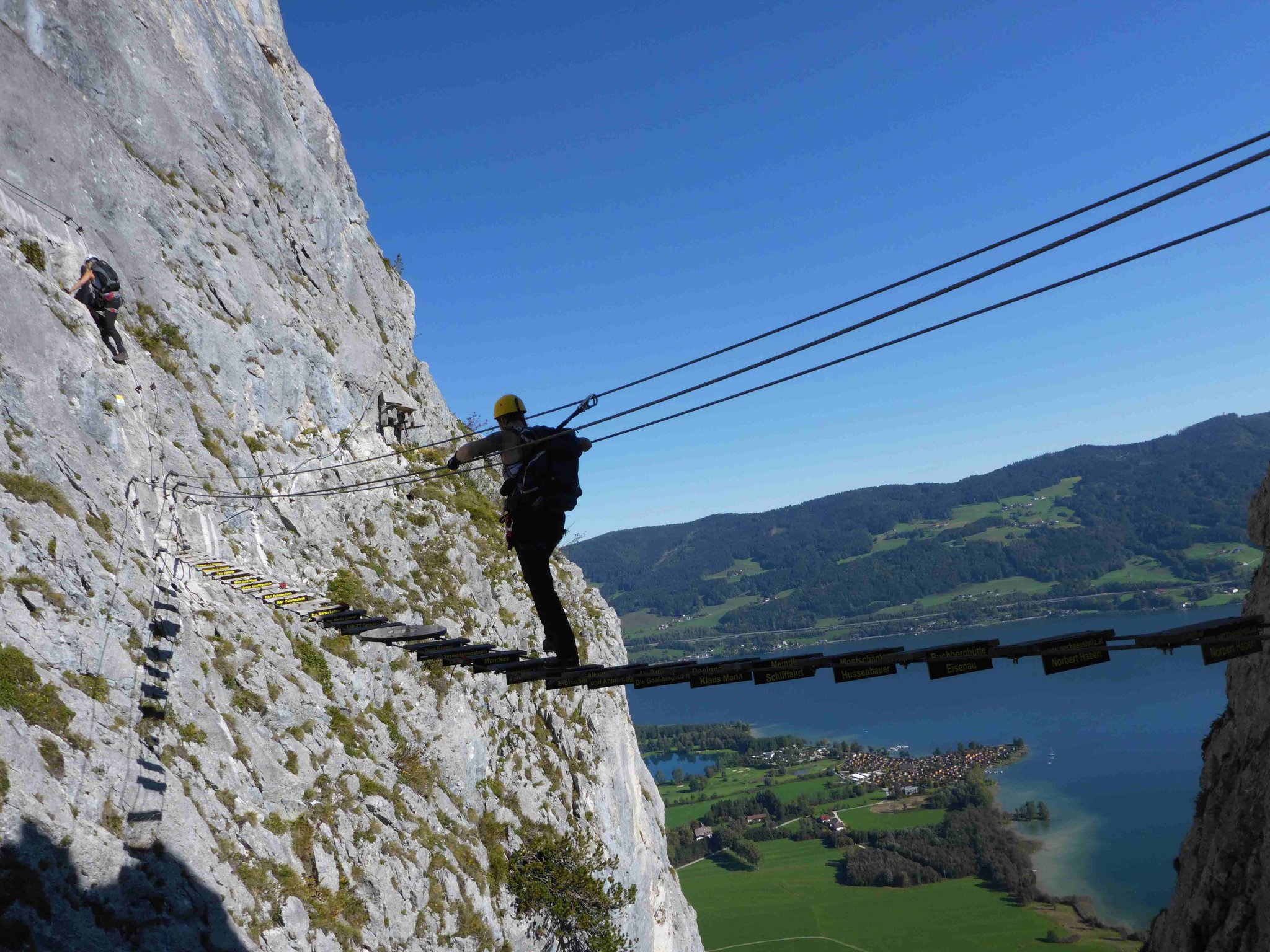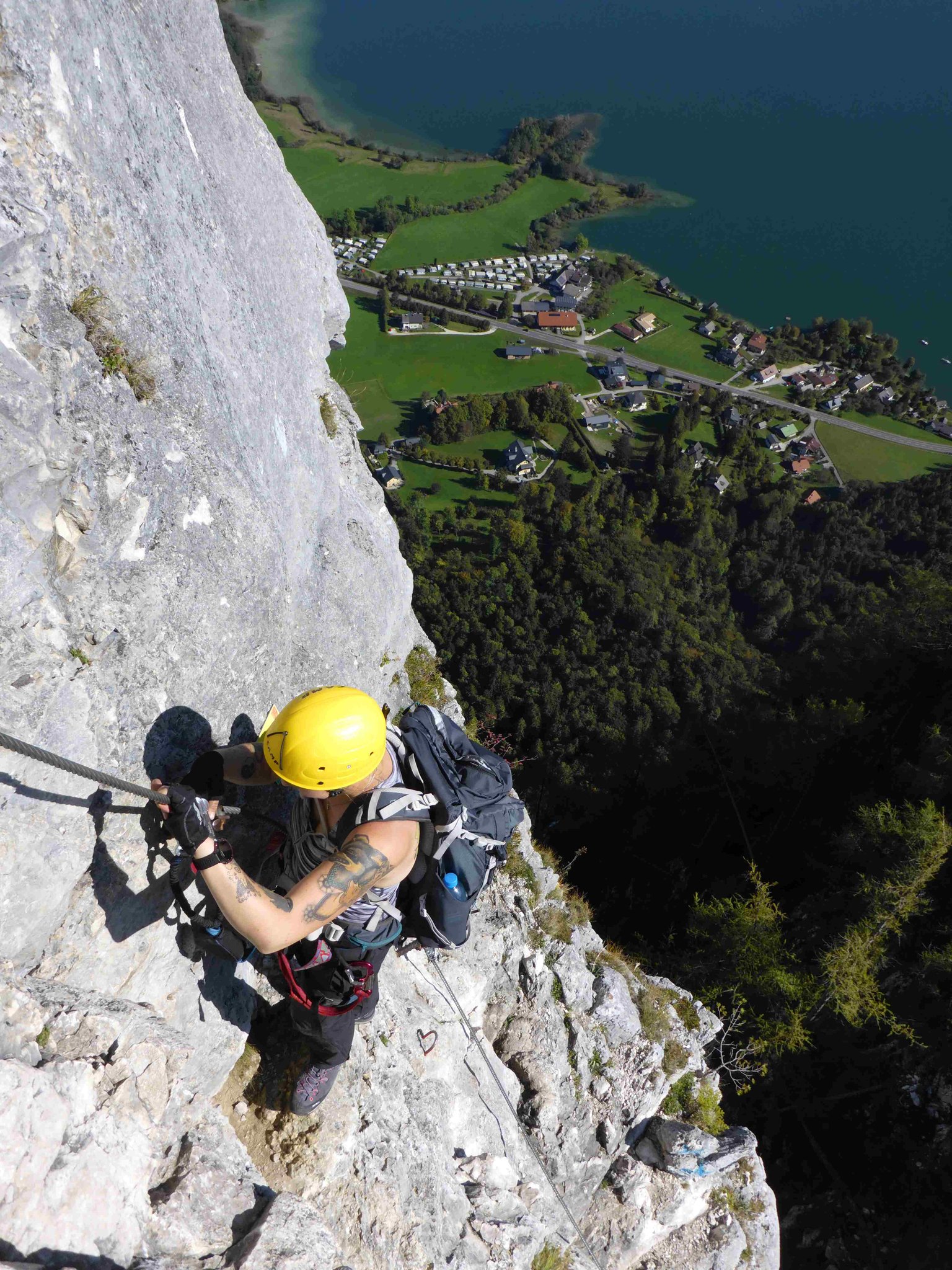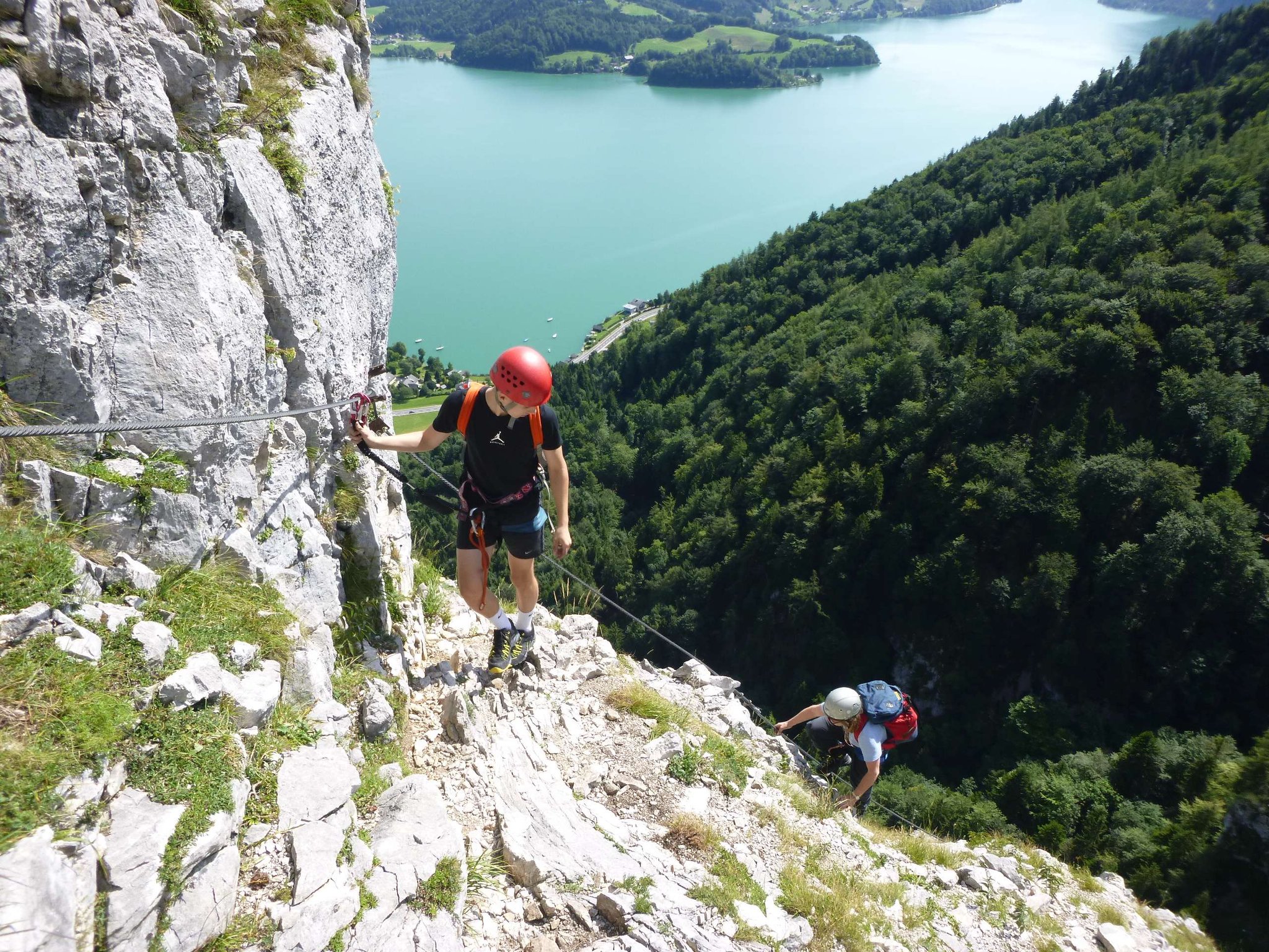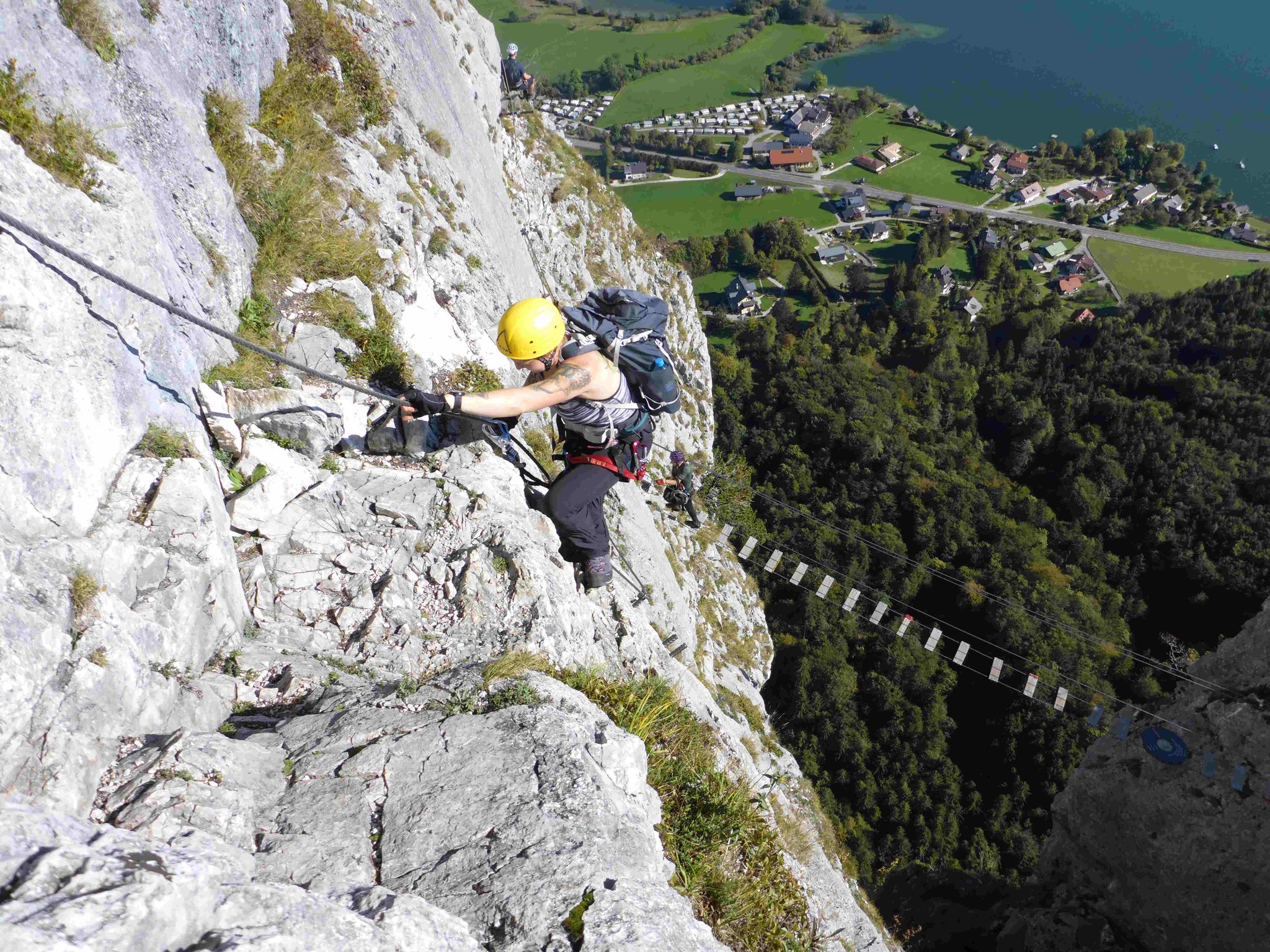 Erlebe die spektakuläre Klettersteigtour am Drachenwand Klettersteig über dem Wolfgangsee mit einem erfahrenen staatlich geprüften Bergführer. Der Drachenwand-Klettersteig ist eine der schönsten Via Ferrata-Routen im Salzkammergut und bietet beeindruckende Ausblicke auf den See und die umliegenden Berge.