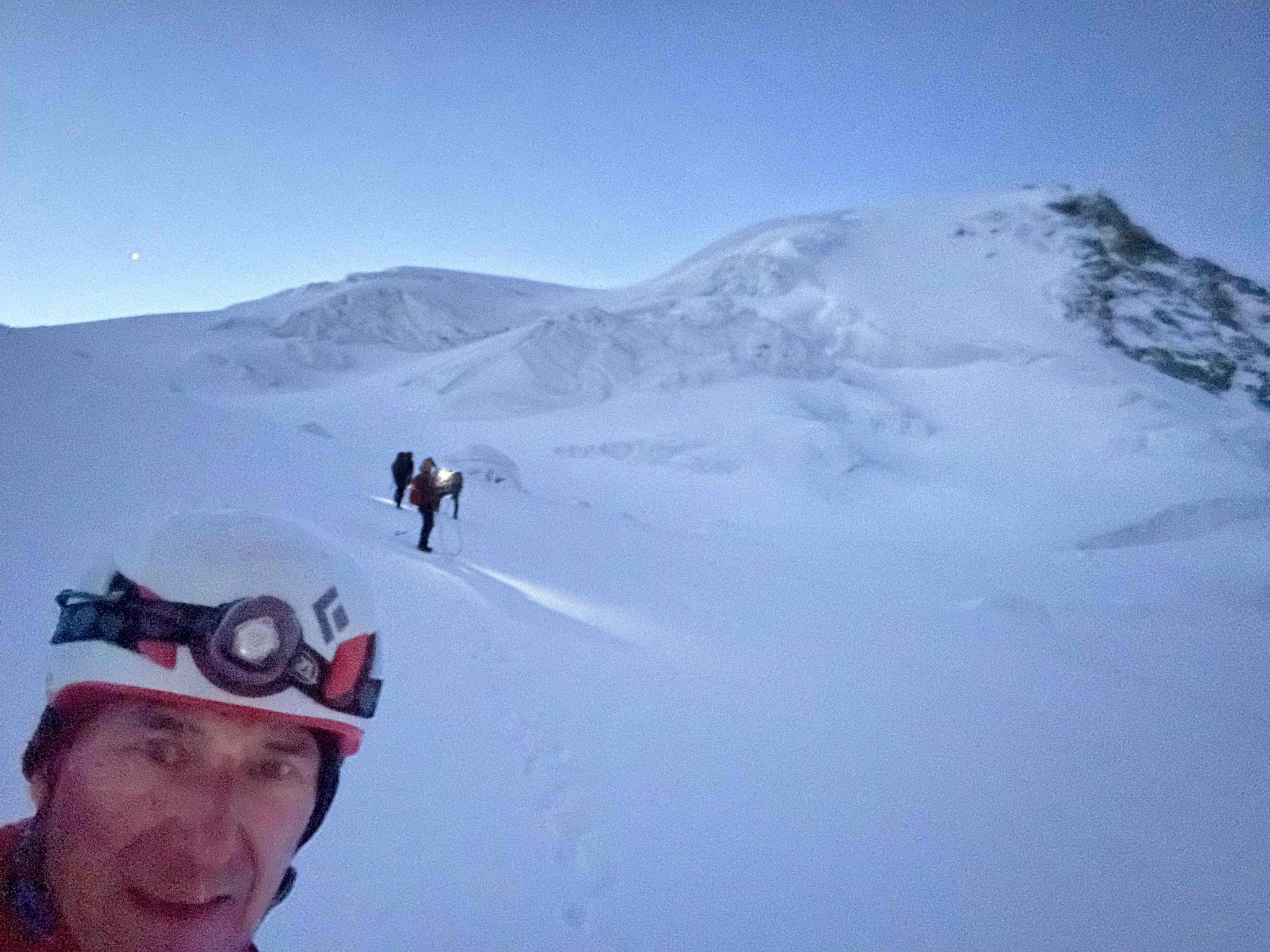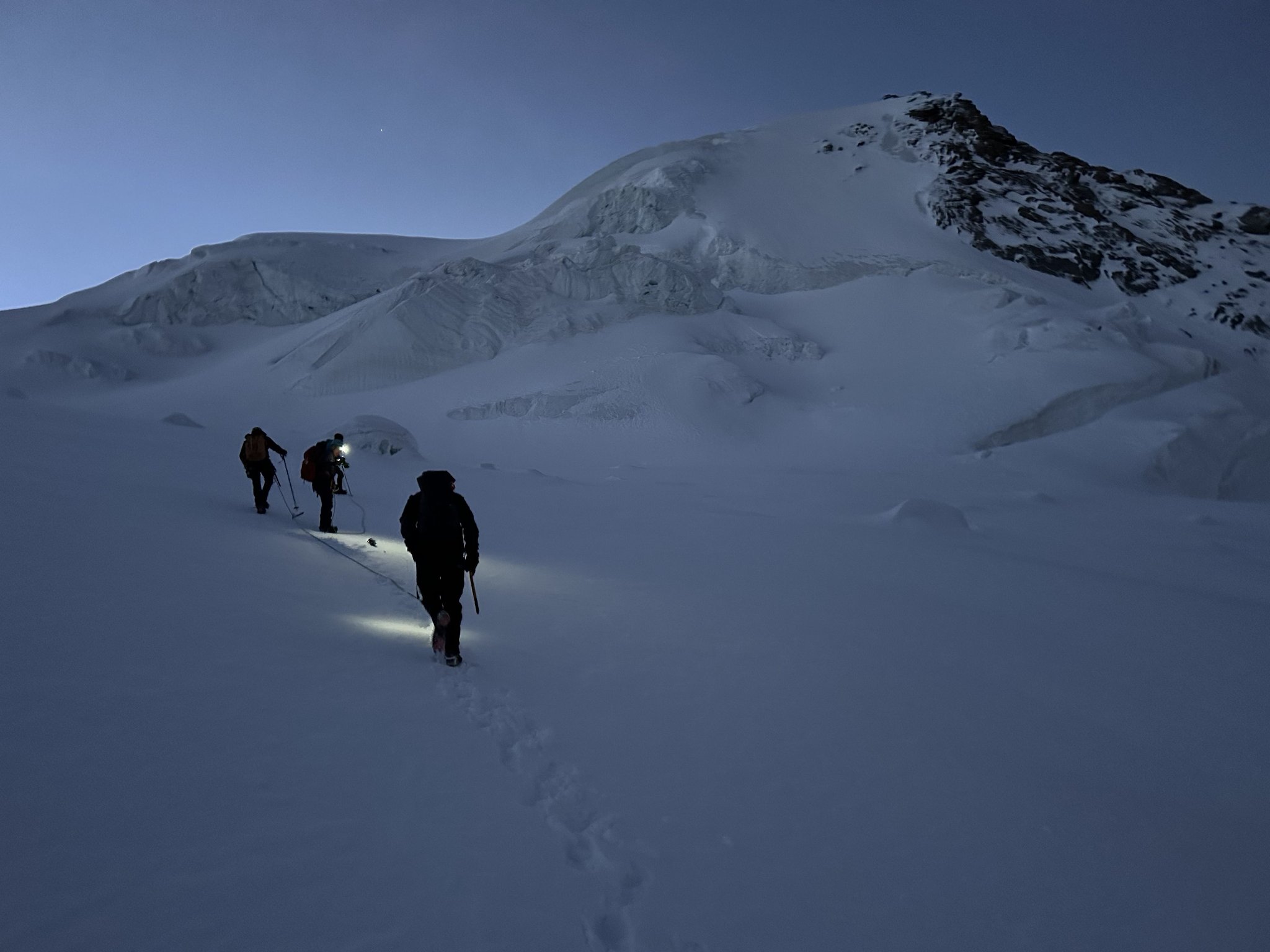 Noch vor Sonnenaufgang starten wir nach einem frühen Frühstück im Schein der Stirnlampen in Richtung Rosagletscher. Zunächst führt der Weg durch die felsige Moränenlandschaft oberhalb der Hütte – ein sichtbares Zeugnis des Gletscherrückgangs.