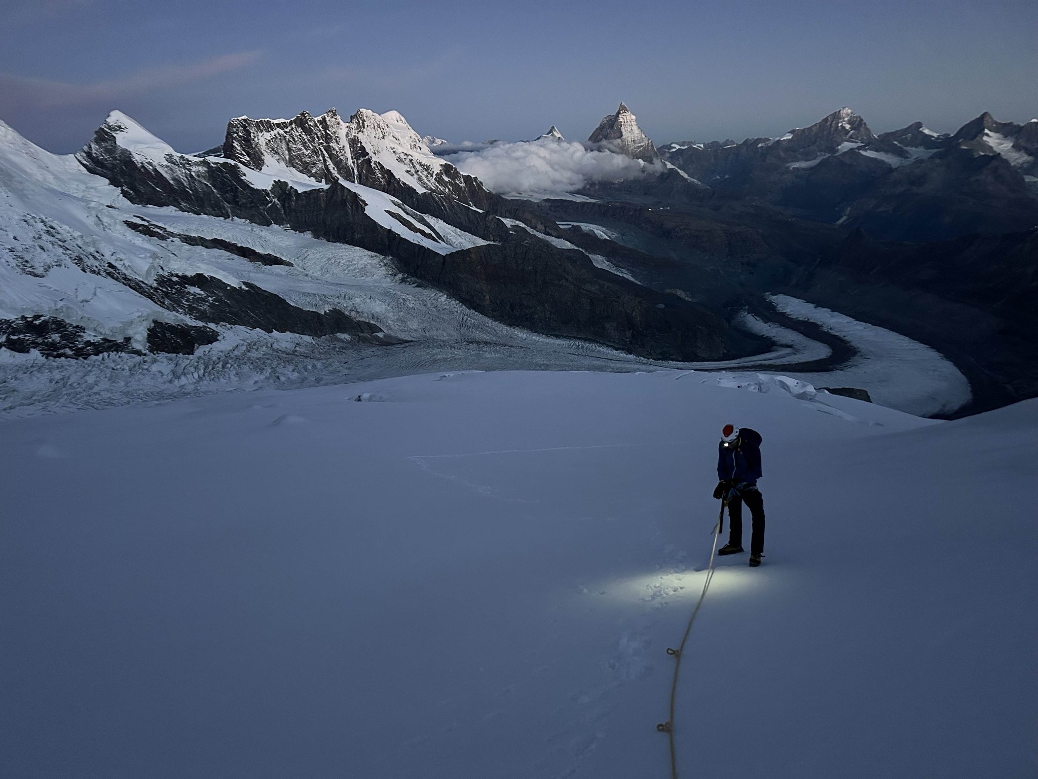Am Gipfel der Dufourspitze (4.634 m) eröffnet sich ein überwältigendes Panorama über die gesamte Walliser Bergprominenz – ein Moment, der lange in Erinnerung bleibt. Nach ausgiebigem Gipfelgenuss erfolgt der Abstieg entlang der Aufstiegsroute zurück zur Monte-Rosa-Hütte und weiter mit einem fordernden Gegenanstieg zur Station Rotenboden. Von dort bringt uns die Bahn müde, aber glücklich zurück nach Zermatt.