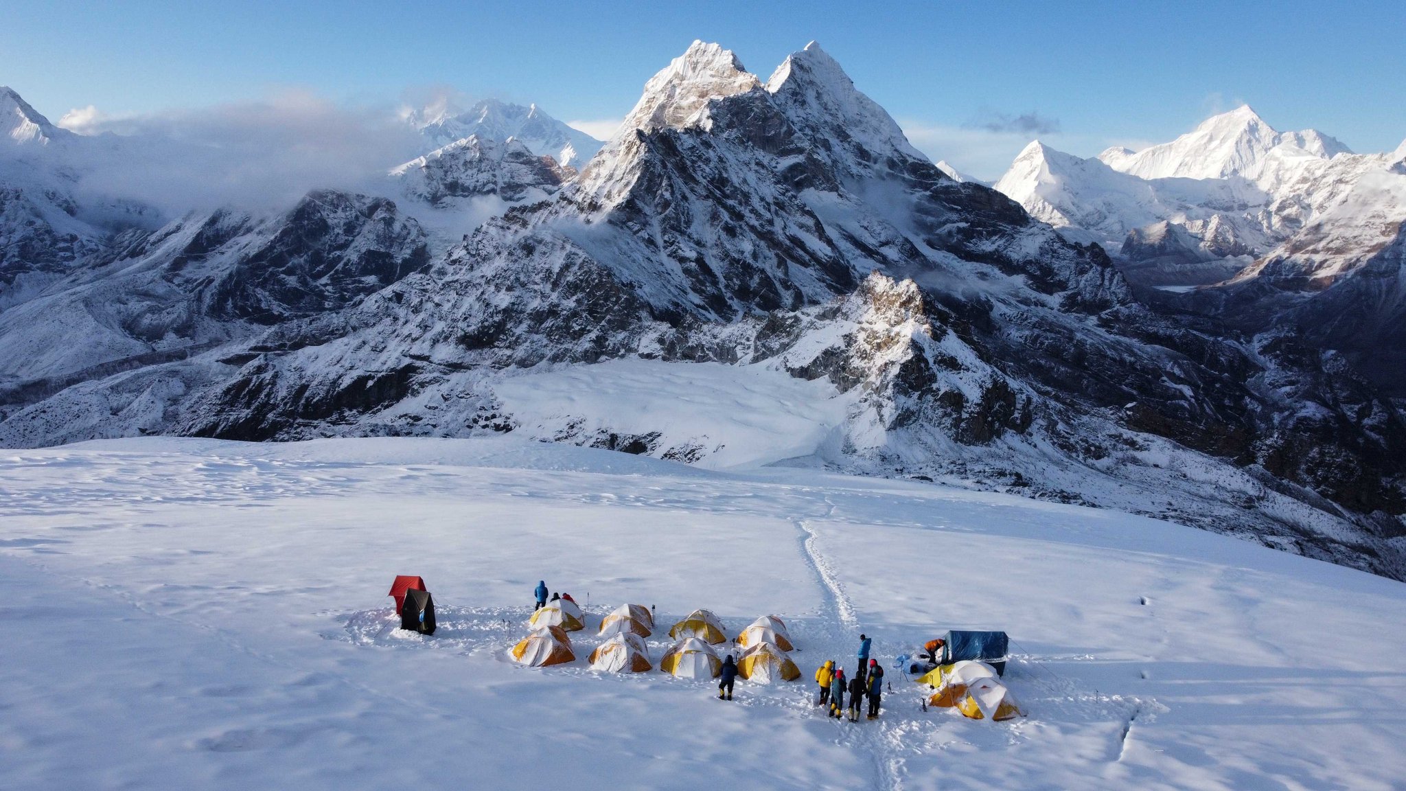 Dabei besteigt man zur Vorbereitung und finalen Akklimatisation den Gipfel Mera Peak (6463m) und erreicht anschließend das Basislager des Mount Everest. Die Sherpas richten schon im Vorhinein die Hochlager und Sauerstoffdepots ein. Sobald das Wetterfenster passt, kann der Gipfelanstieg beginnen.