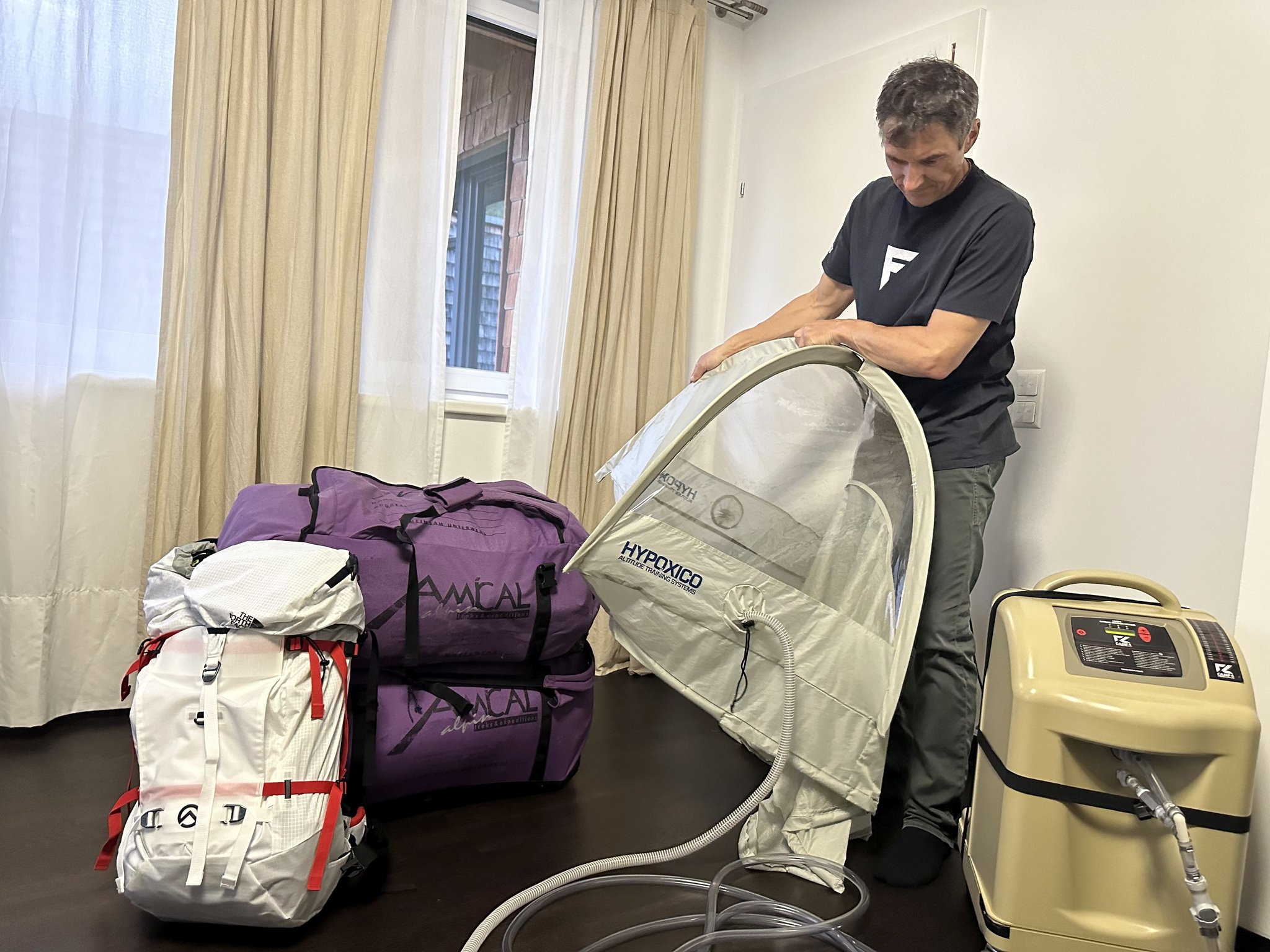 Um die Erfolgschancen zu erhöhen, schlafen die Expeditionsteilnehmer bereits 6-8 Wochen vor Reiseantritt in einem Hypoxiezelt, in dem der Körper auf eine Höhe akklimatisiert wird, die einem 7000er entspricht.