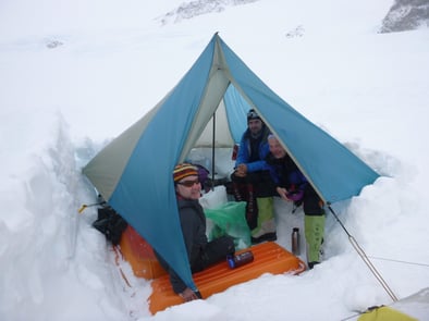 Abwarten im Küchenzelt auf Wetterbesserung für den geeigneten Aufstieg ins nächste Camp.