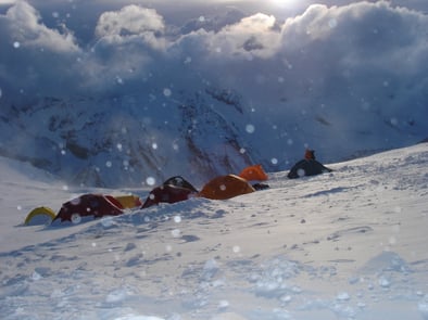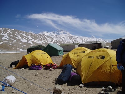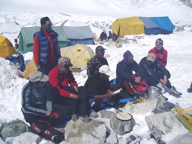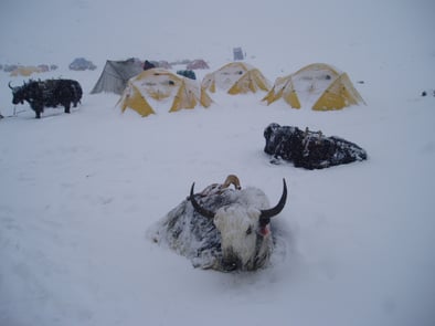 Das Basislager wird nach einem 2 - tägigem Anmarsch vom unteren Basislager erreicht, die Lasten, etwa 1.600 kg, werden von 39 Yaks transportiert.