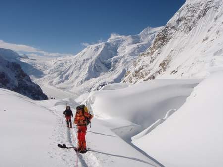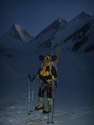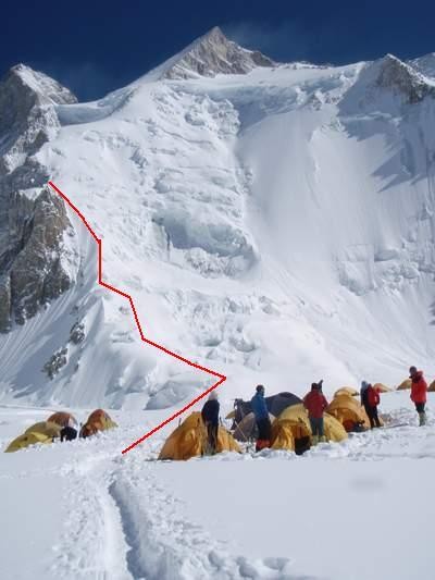 Baltoro-Gletschers bewältigt und zwischen Basislager und Lager I ein Eisbruch durchstiegen werden, in dem die Wegfindung bisweilen auch etwas “tricky” sein kann. Die Route folgt ab dem Lager I dem SW-Sporn bis in 7400 m Höhe und quert