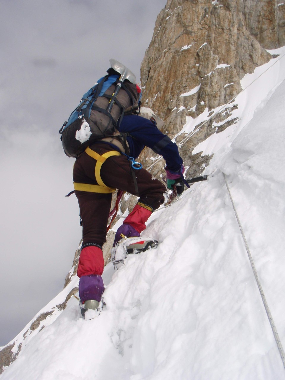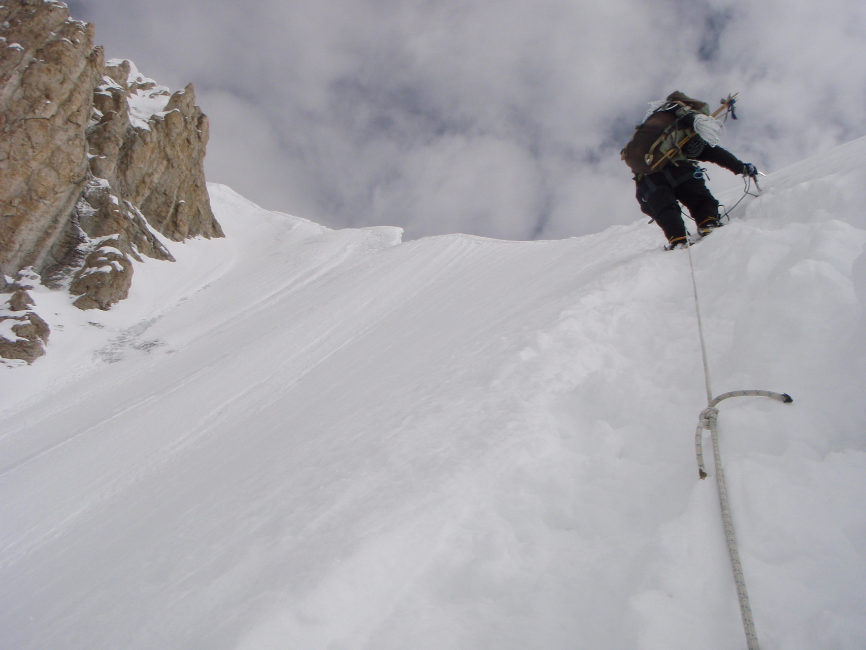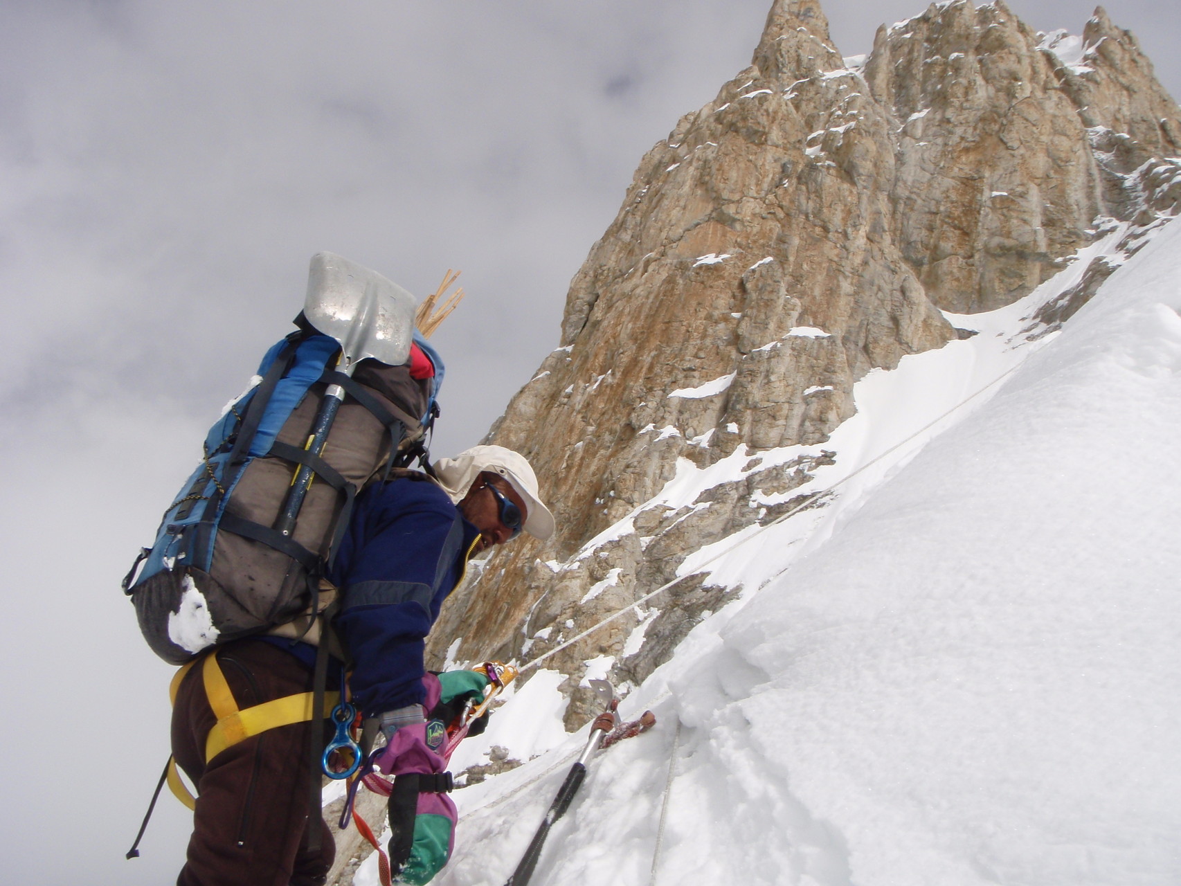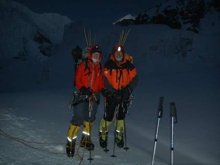 dann unter der Gipfelpyramide zum firnigen SO-Grat. Teile des Aufstiegs liegen auf längere Strecken bei über 40° Steilheit. Der Berg wurde im Jahre 1956 von einer dreiköpfigen österreichischen Gruppe erst bestiegen.