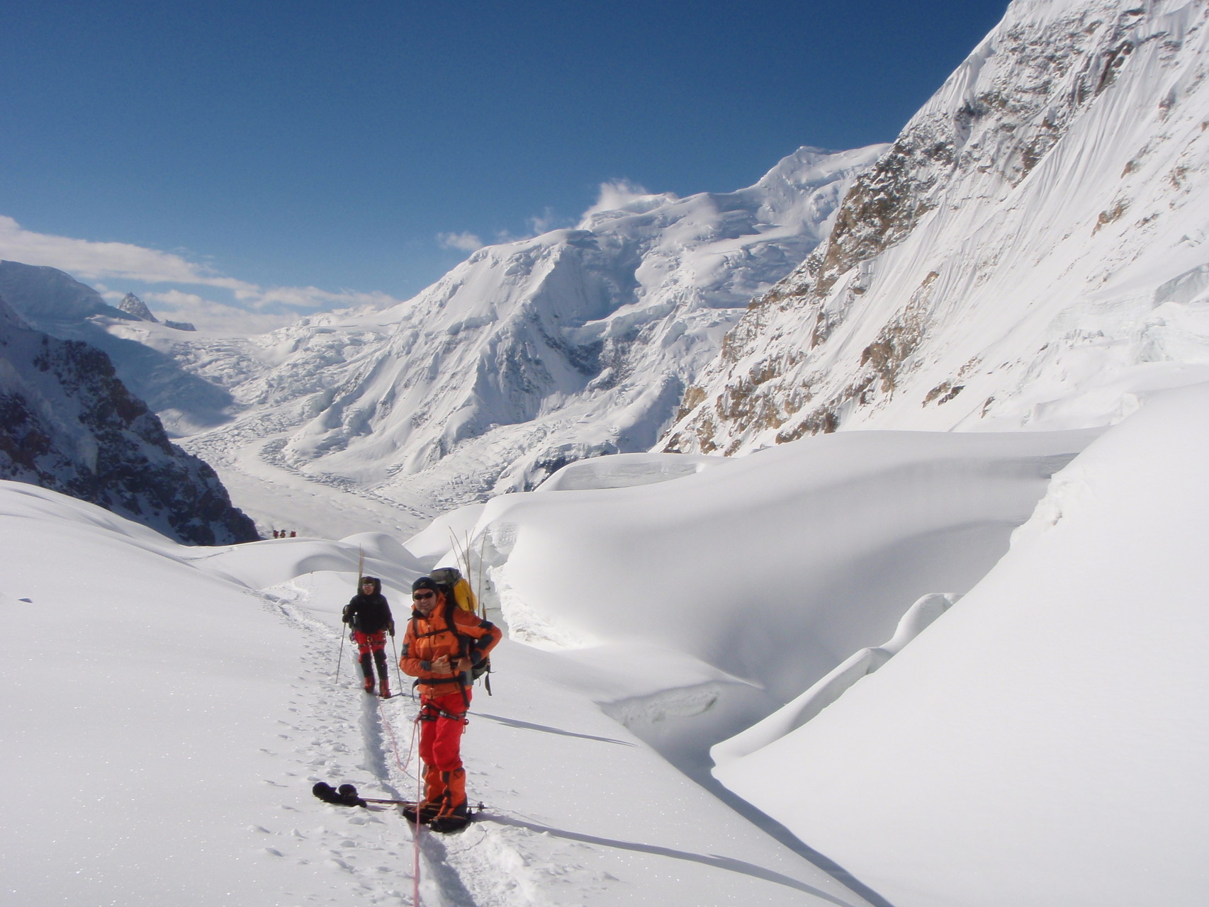 Zunächst aber steht das Einrichten der Route und der Höhenlager im Vordergrund. In den ersten Tagen muss der Weg durch das Spaltengewirr des oberen Abruzzi-Gletschers gefunden werden. Auf Grund der Erwärmung erfolgte der Aufbruch immer um 01.00 Uhr morgens.