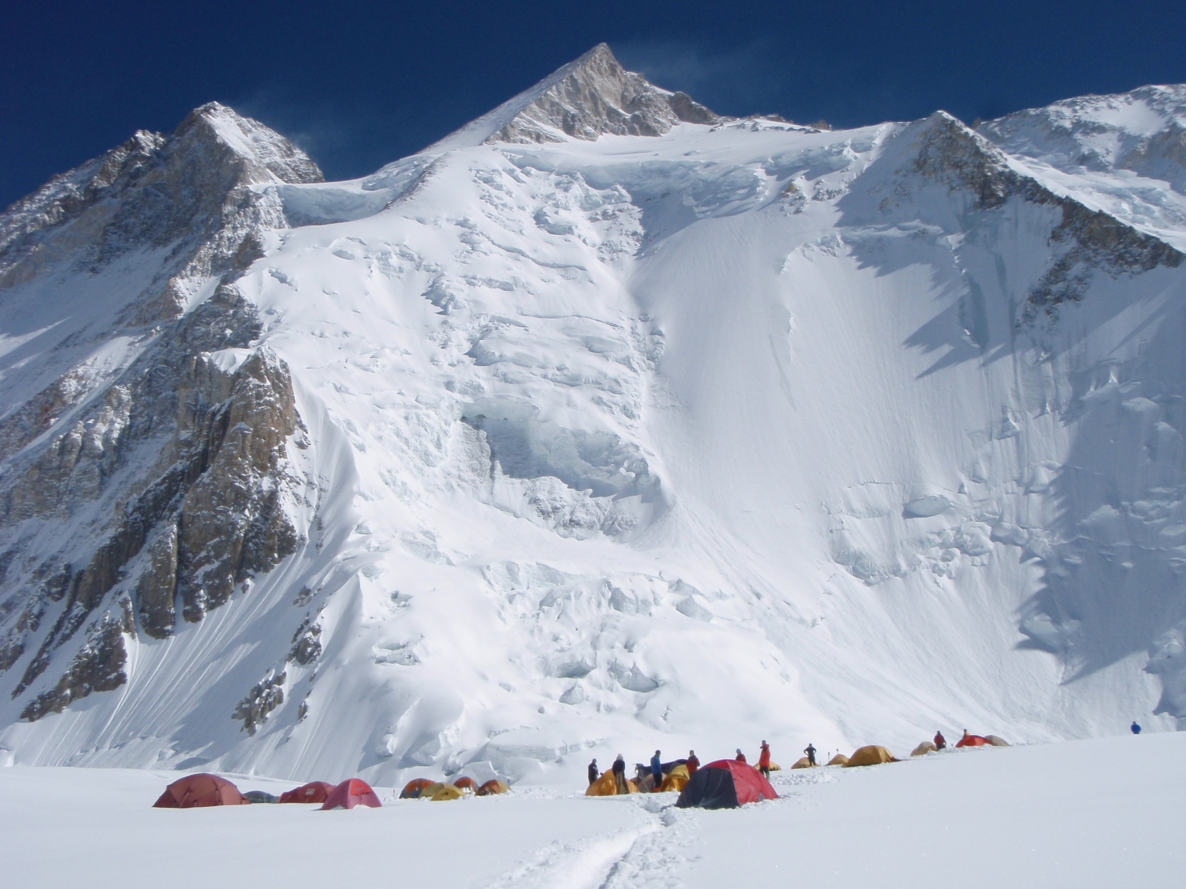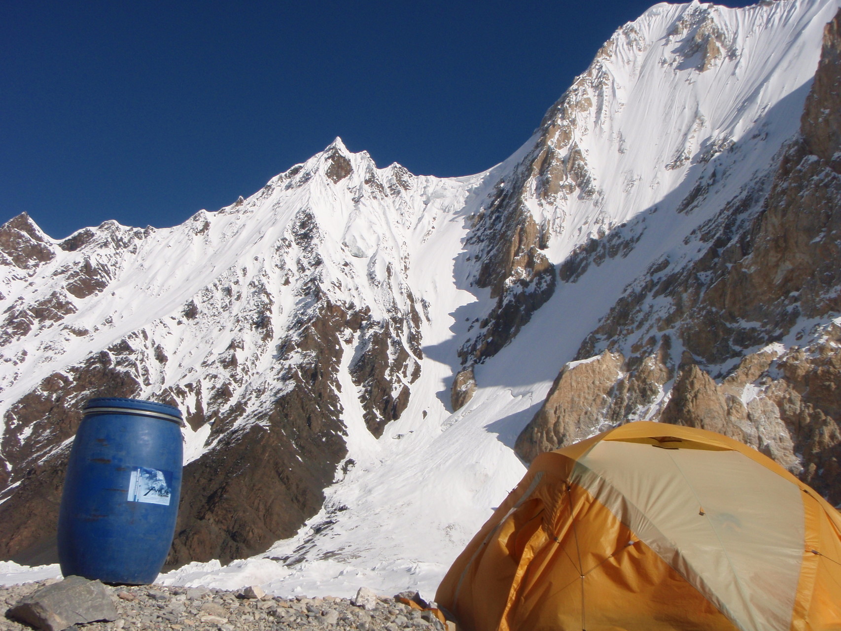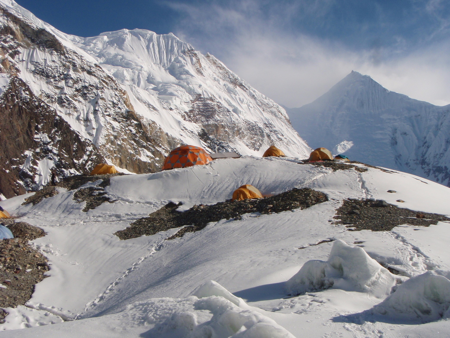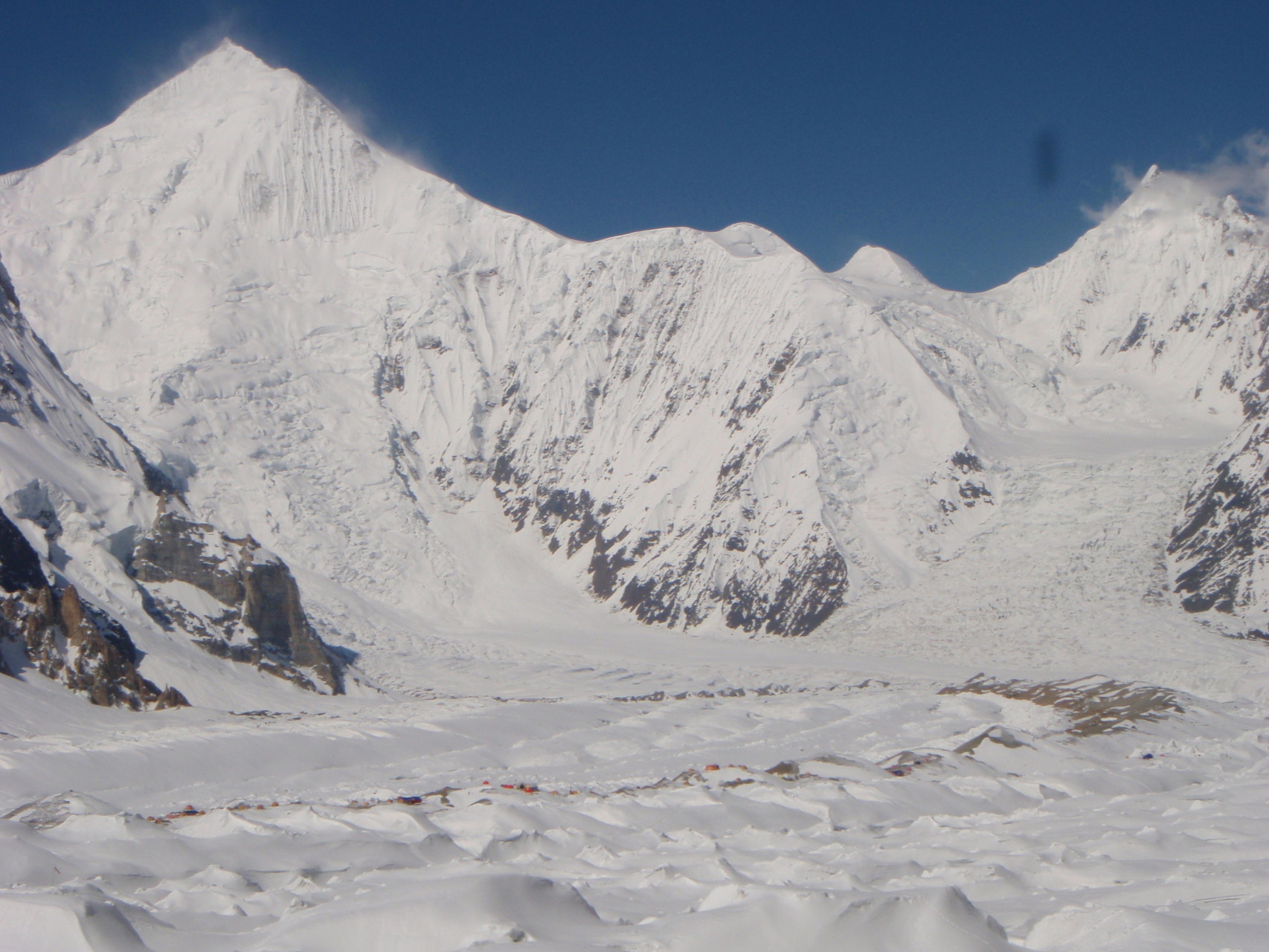 Hochlager I, 5.950 m, mit weiterer Aufstiegsroute und Gipfel im Hintergrund