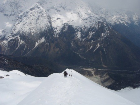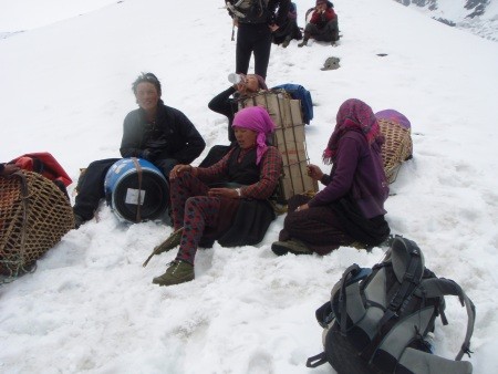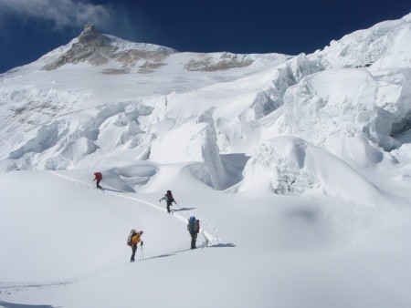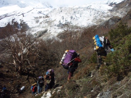 Basislager zeit um die Hochlager einzurichten, Fixseile an gefährlichen Passagen zu verlegen und einen Gipfelgang zu versuchen. Der Rückweg nach Kathmandu führt in sechs Tagen über den 5000 m hohen Larkya Pass ins Marsyangdi Tal an der Annapurna Runde. Der Materialtransport und der Lageraufbau wird mit Hilfe von einem Sherpa-Hochträger bewältigt.
