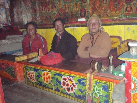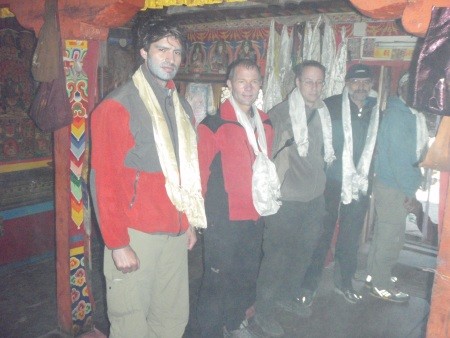 Das Amical Team beim 6 -tägigen Anmarsch zum Tibeterdorf Samagaon, am Fuße des Manaslu gelegen. Auf dem Weg, stark geprägte tibetische Dörfer im BuriGandaki Tal. Pusha Zeremonie im Kloster in Samagaon - 3.450 m. Kataks (Seidenschale) als Glücksbringer für die kommenden 26 Tage am Berg.