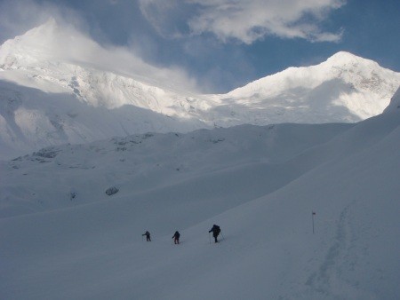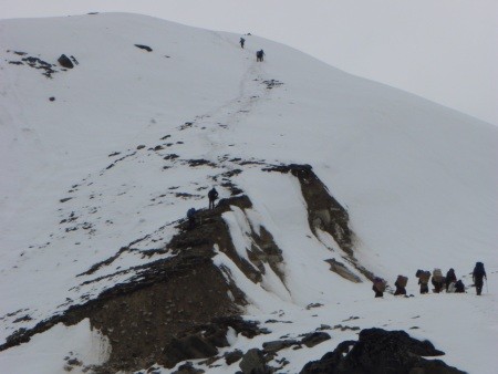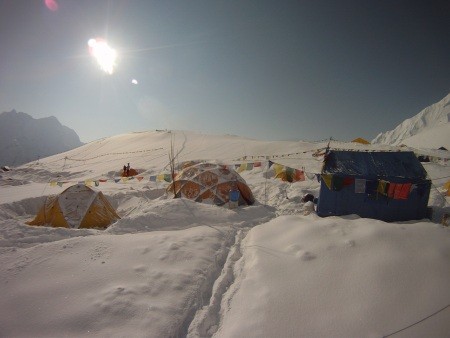 In den letzten Tagen kam es in den Nachmittagsstunden immer wieder zu ergiebigen Schneefällen. Das Basislager und die Einzelzelte sind mittlerweile über die Hälfte von Neuschnee umringt. Unsere Gruppe musste die Zelte immer wieder ausschaufeln und auch die Verbindungswege zu Mess- Küchen und Toilettenzelt mussten freigeräumt werden. Unsere Küchenmannschaft sorgt durch eine hervorragende Verpflegung für beste Stimmung und für die Bereitstellung der benötigten Kalorien.