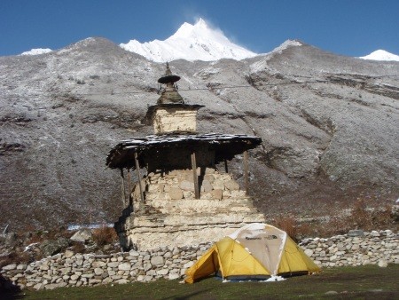 Basislager - 4.850 m. Im Hintergrund der Manaslu. Unser Zuhause für die kommenden 26 Tage.