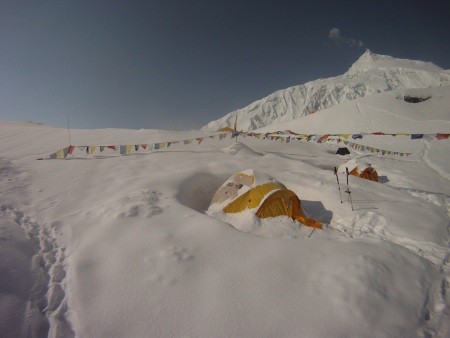 Gut sichtbar die Zelte im tiefen Schnee - mehr als insgesamt 4 Meter gesetzter Neuschnee erwartete uns in diesem Lager bis zum Ende der Expedition.