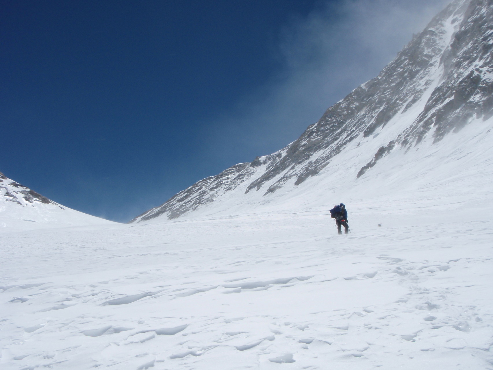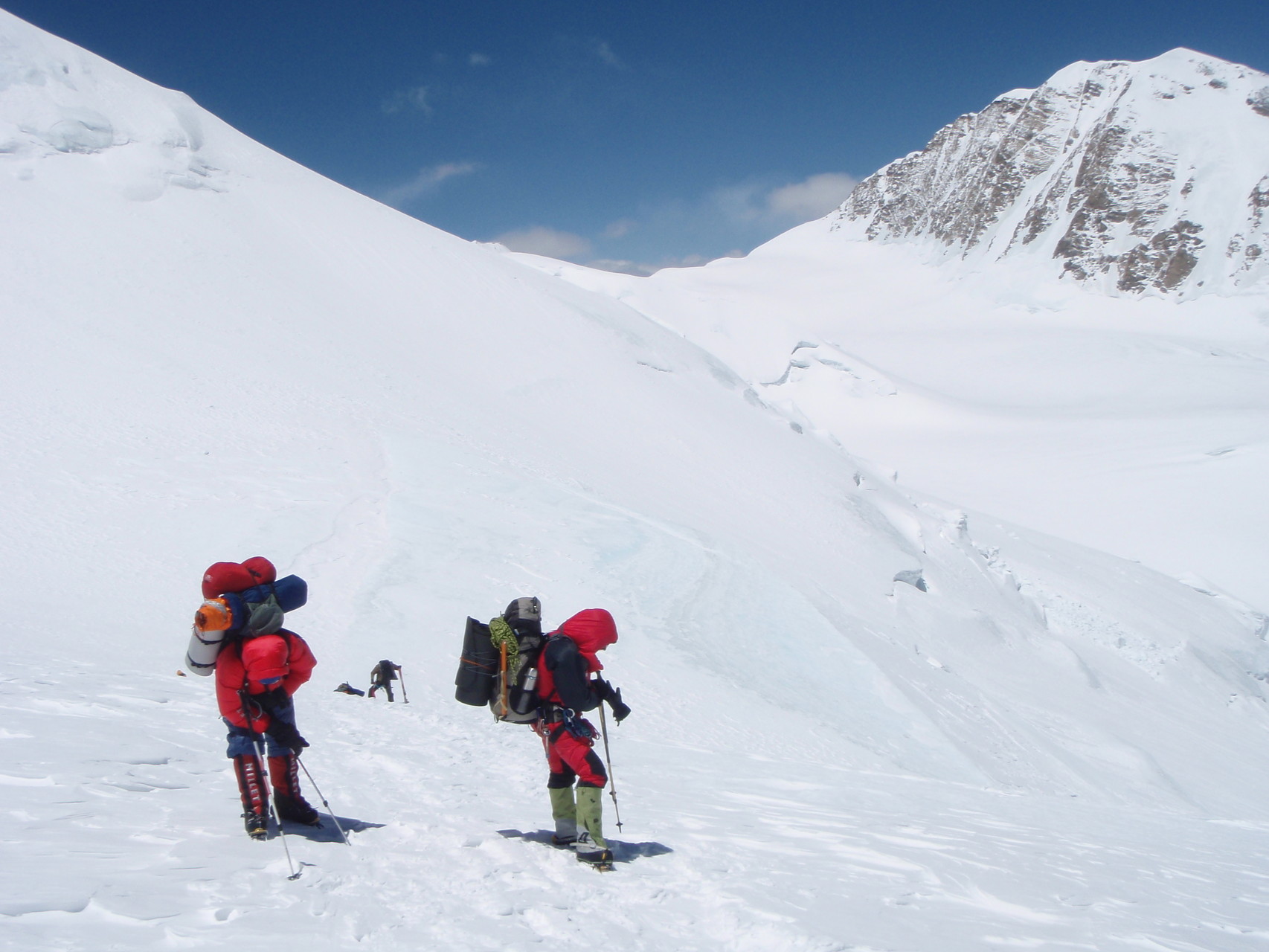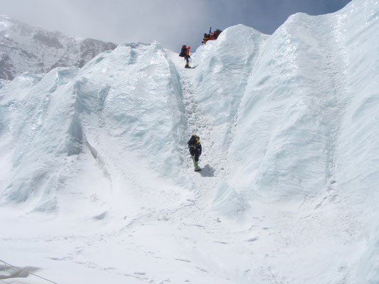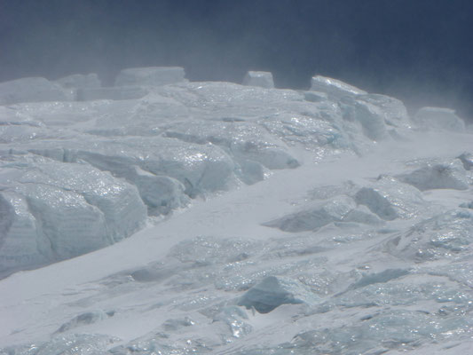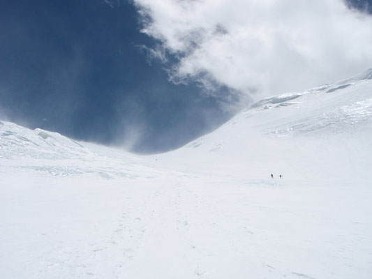 Vom Hochlager 3, 7.150 m führt die bis zu 40 Grad steile Flanke zum Gipfelgrat hoch. In dieser Flanke mussten wir am 13.Mai, auf Grund der tiefen Temperaturen und des starken Windes, gegen 00.30 Uhr umkehren und somit unseren Gipfelgang abbrechen.
