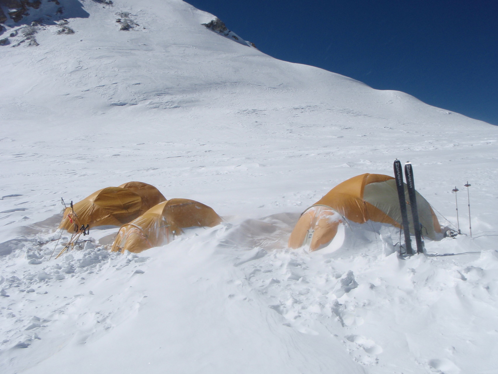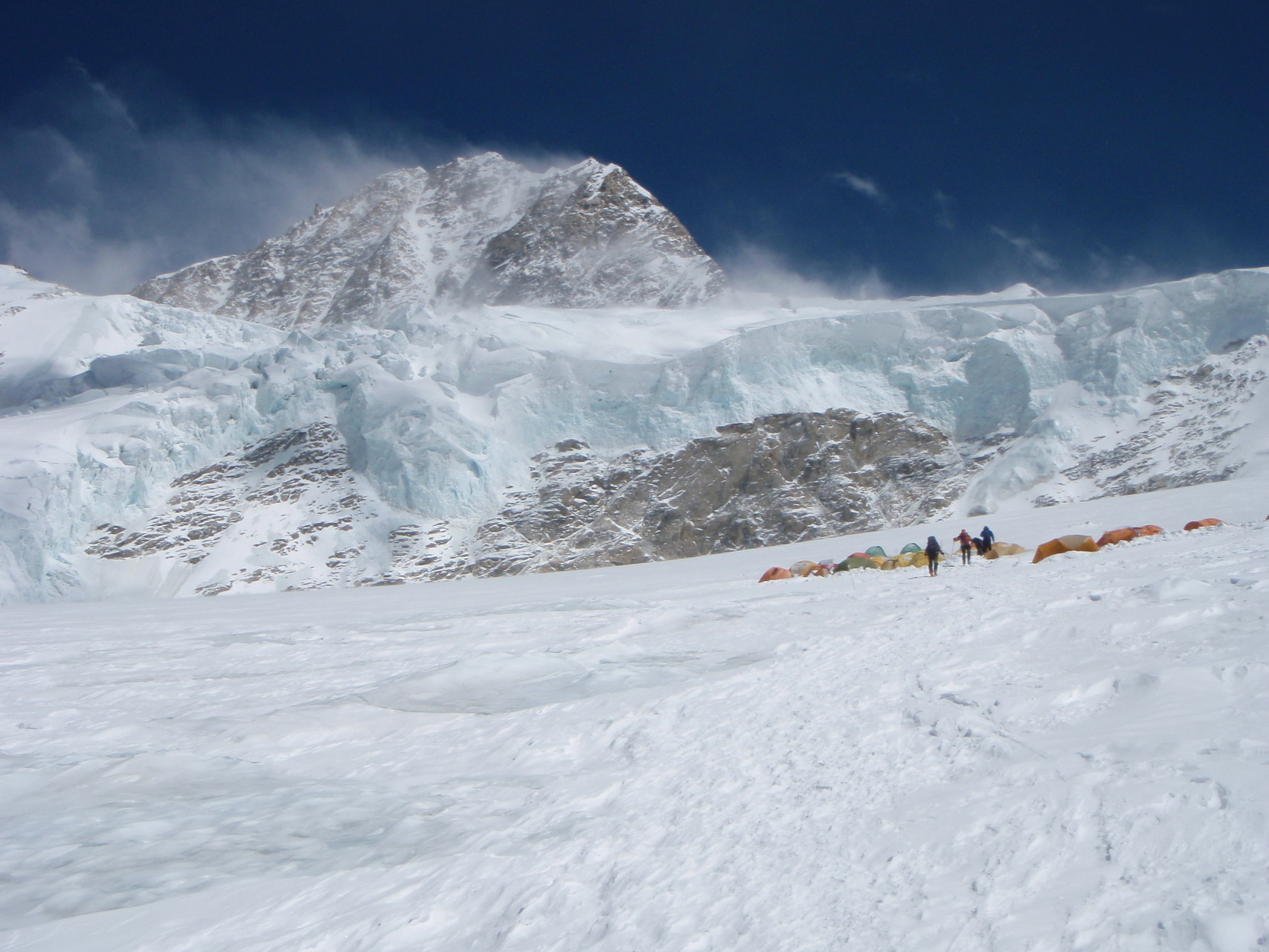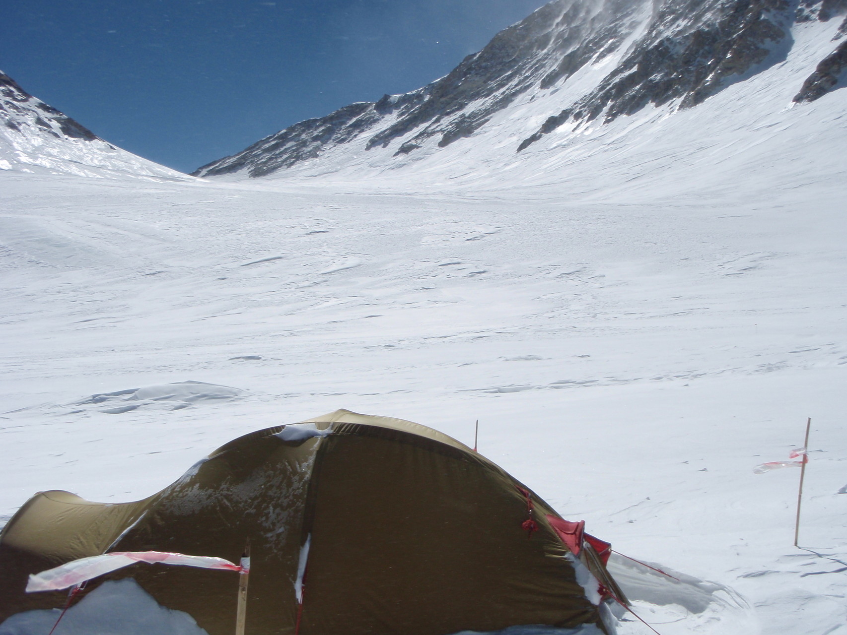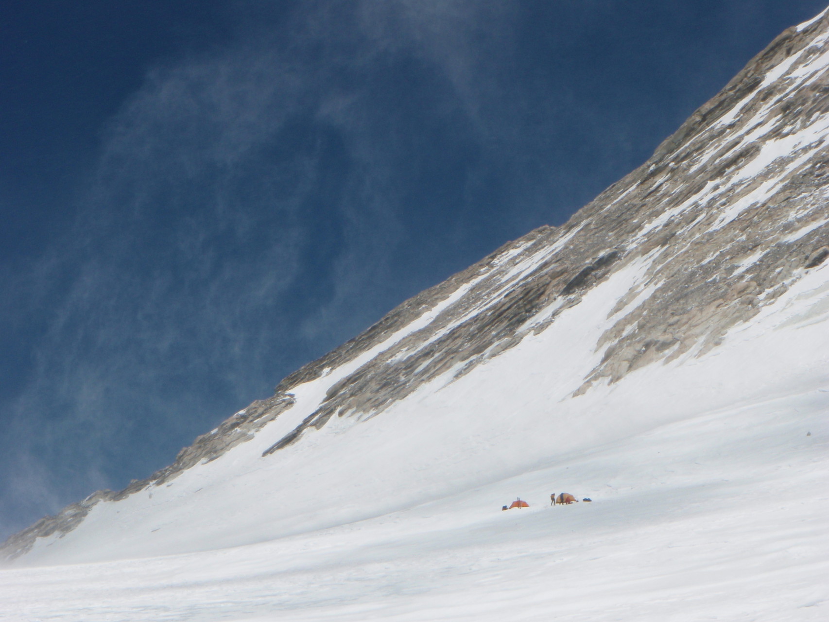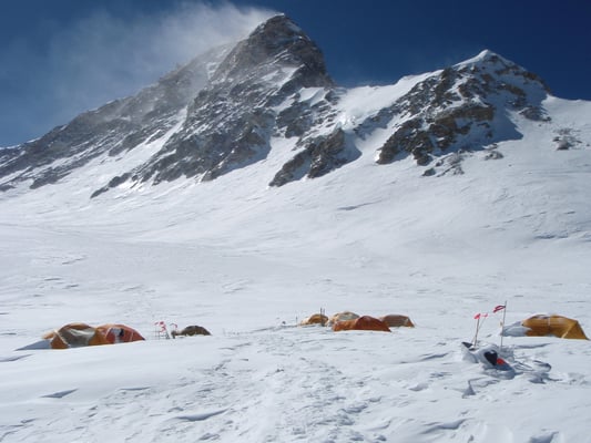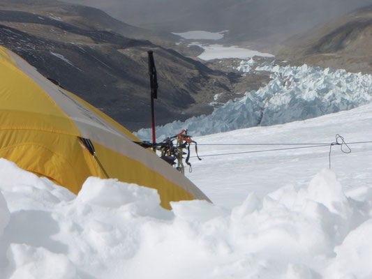 Hochlager 1, 6.350 m. Im Hintergrund gut sichtbar - Schneefahnen - die auf starken Wind hinweisen.