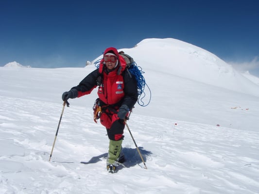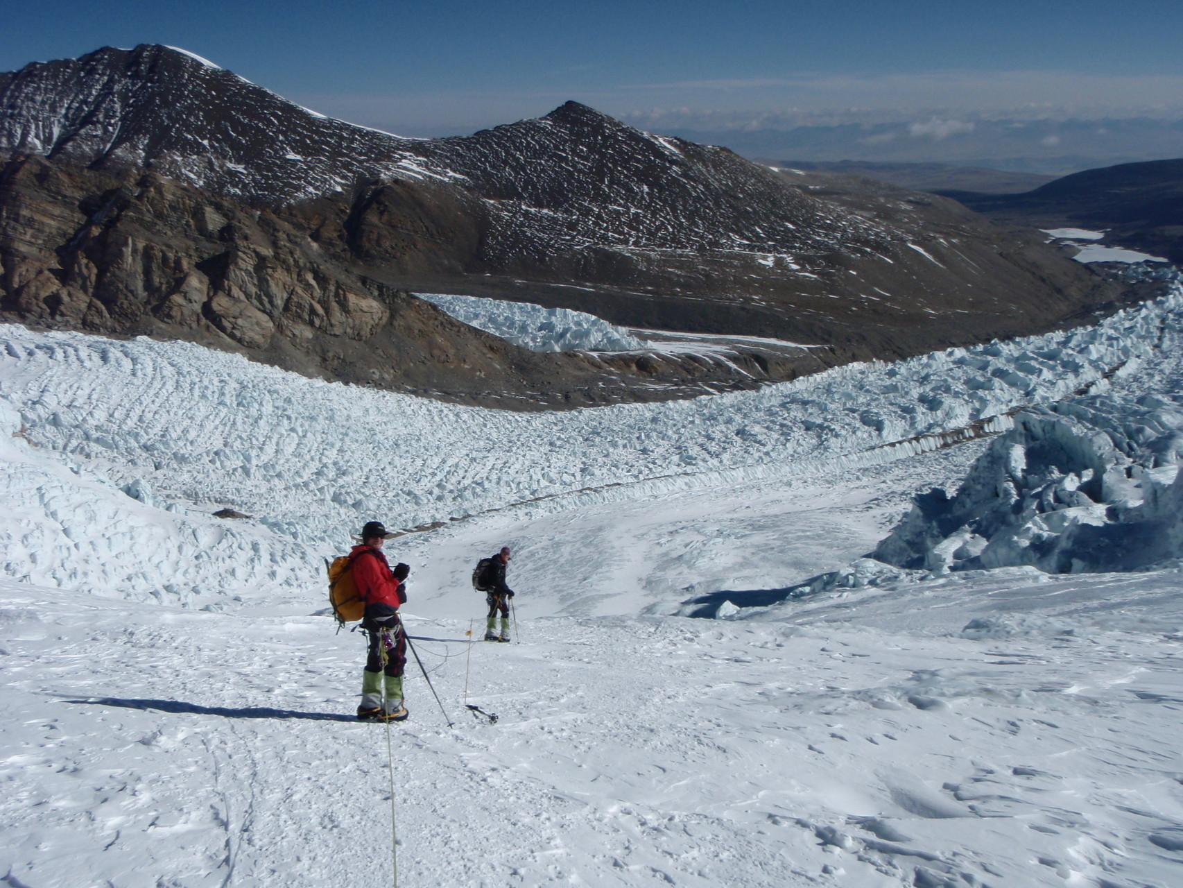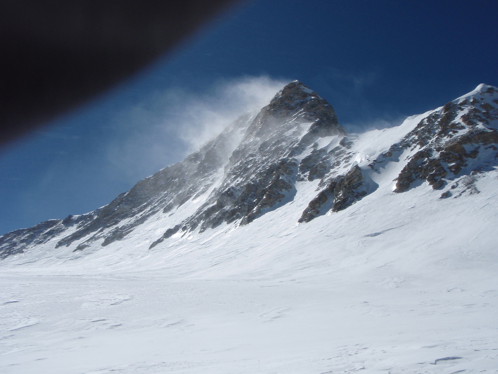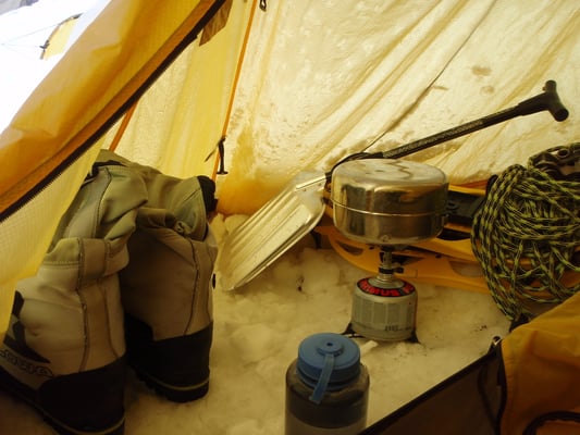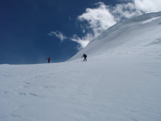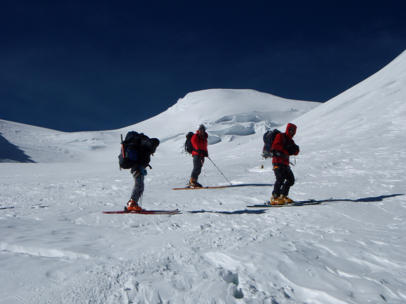 Hochlager 1, 6.350 m. Im Hintergrund gut sichtbar - Schneefahnen - die auf starken Wind hinweisen.