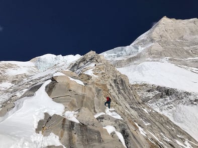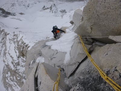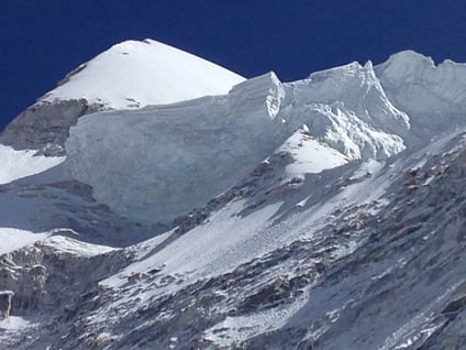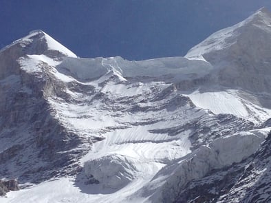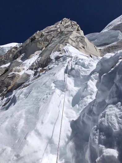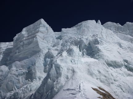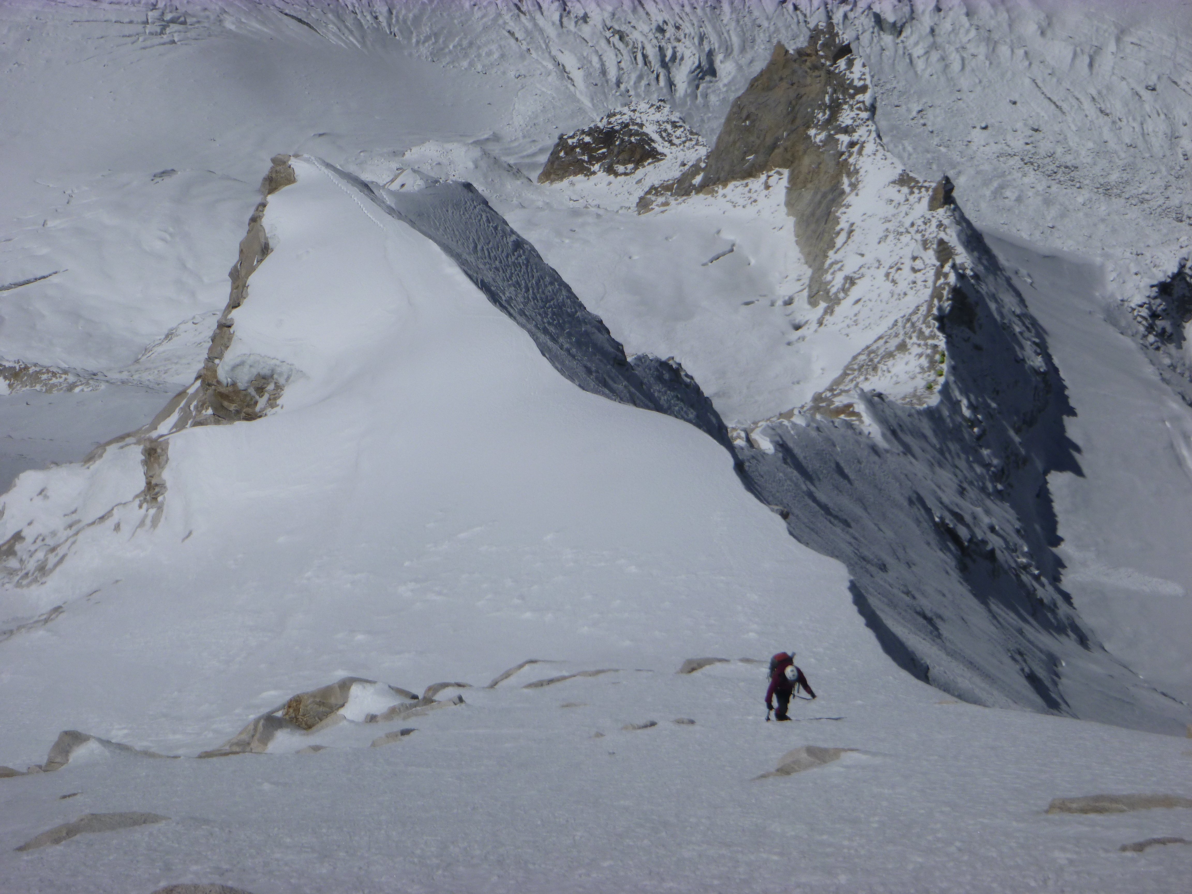 Der Westgrat weist Schwierigkeiten bis zum V Grad auf. Die hohe Schneelage erschwerte den Aufstieg erheblich. Die Schlüsselstelle, ein ca 100 m hoher Eisabbruch, auf 6.000 m.