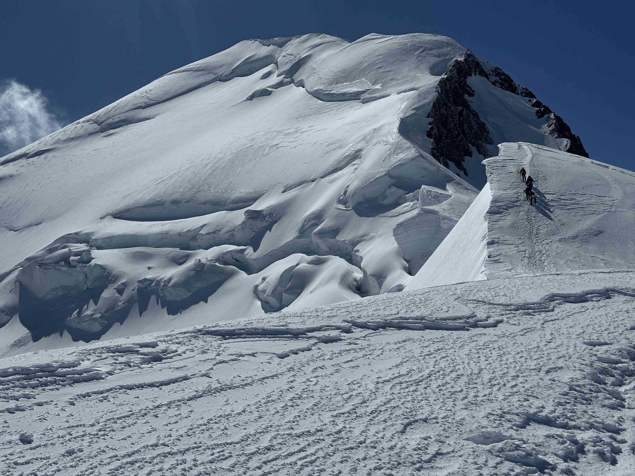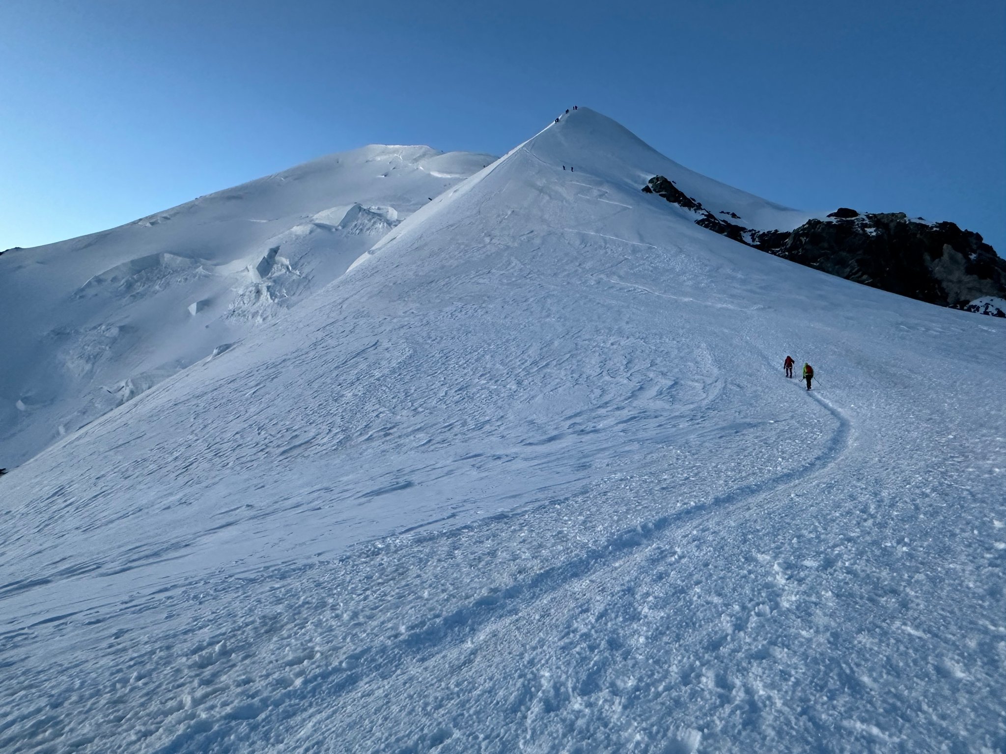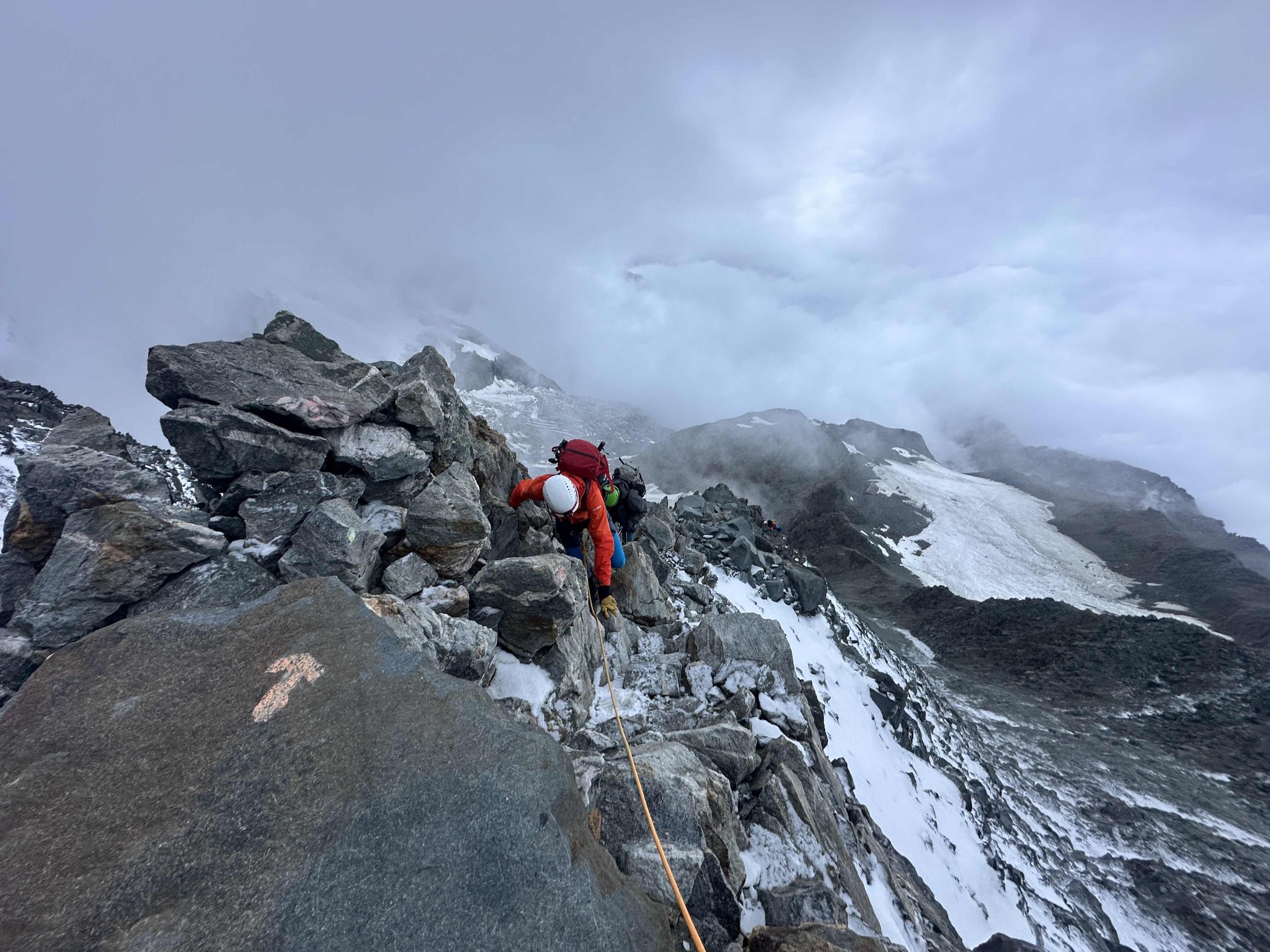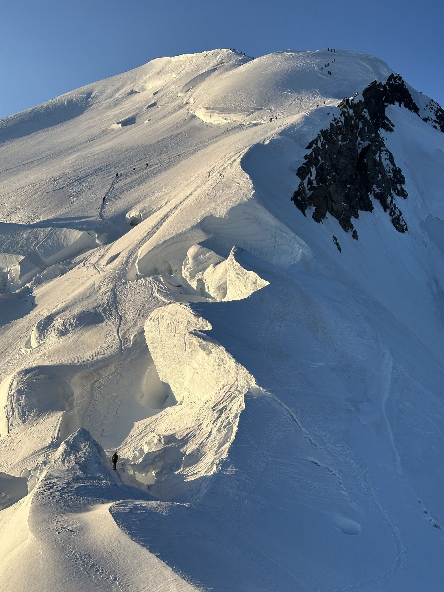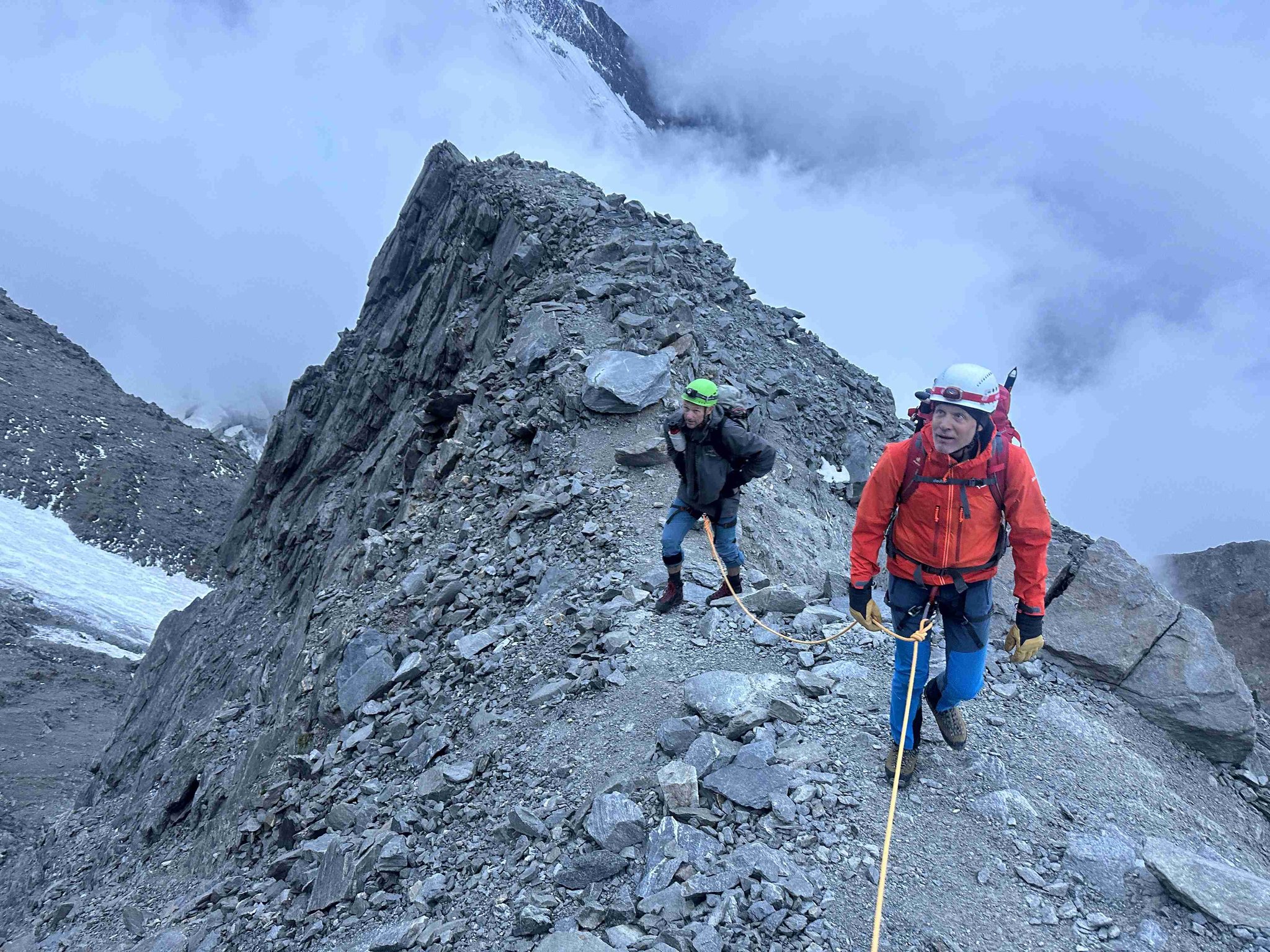 Frühmorgens starten wir durch das „Grand Couloir“, eine Steinschlag-gefährdete Rinne, die wir noch im Schatten passieren. Nach ca. 2 Stunden erreichen wir