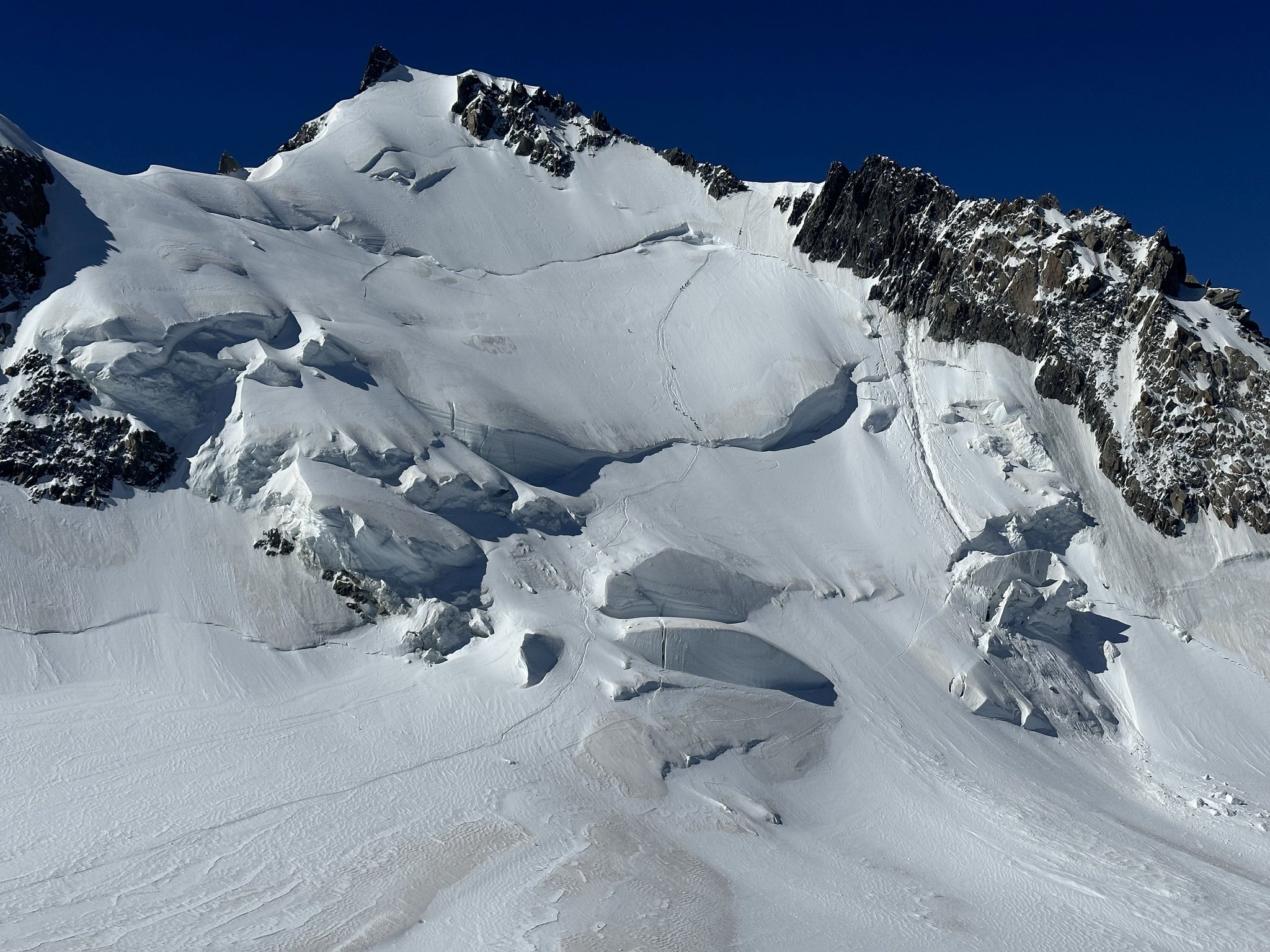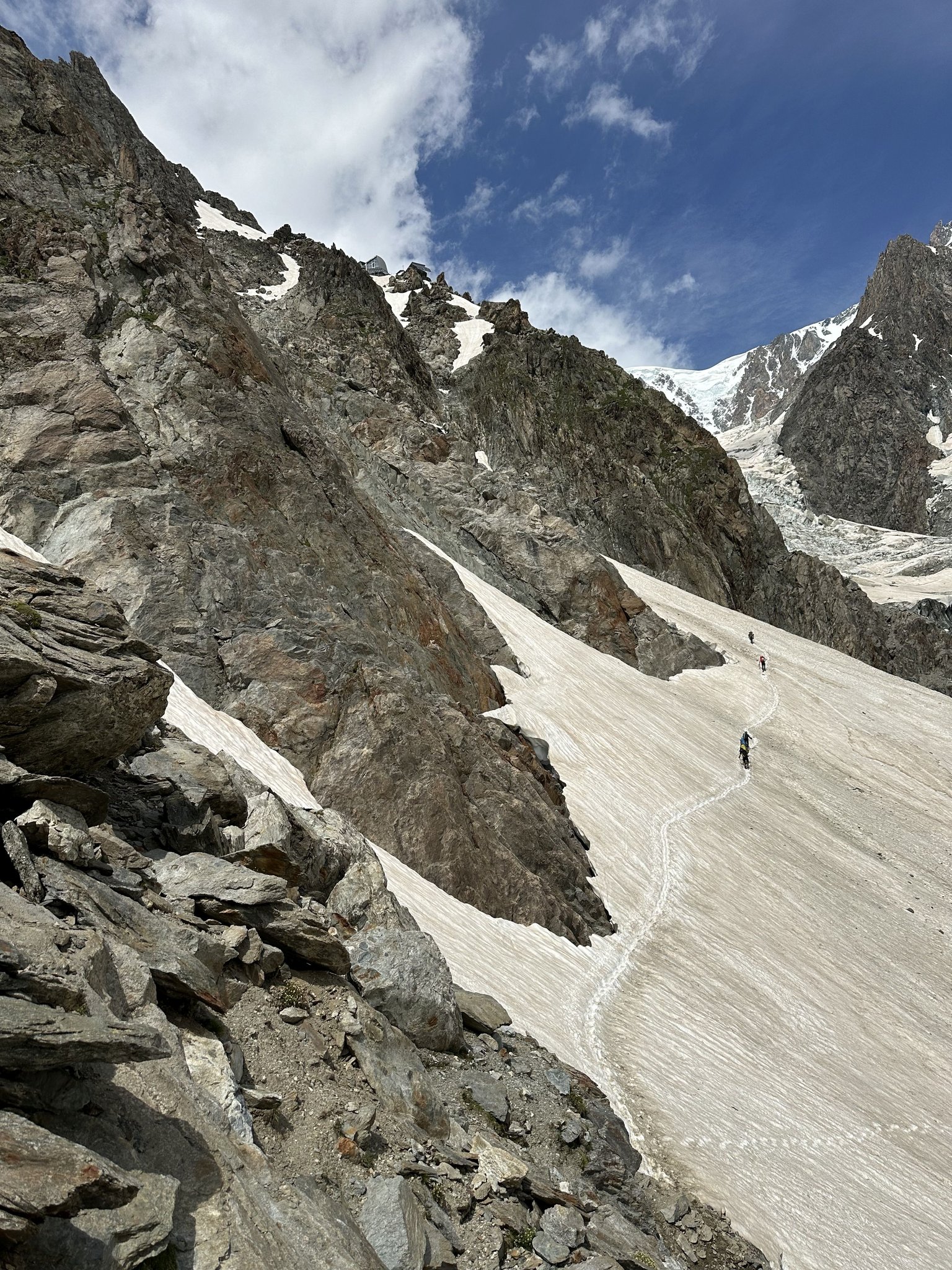 Nach dem Gipfelerlebnis erfolgt der anspruchsvolle Abstieg über die Trois Mont Route bis zur Cosmiques Hütte.