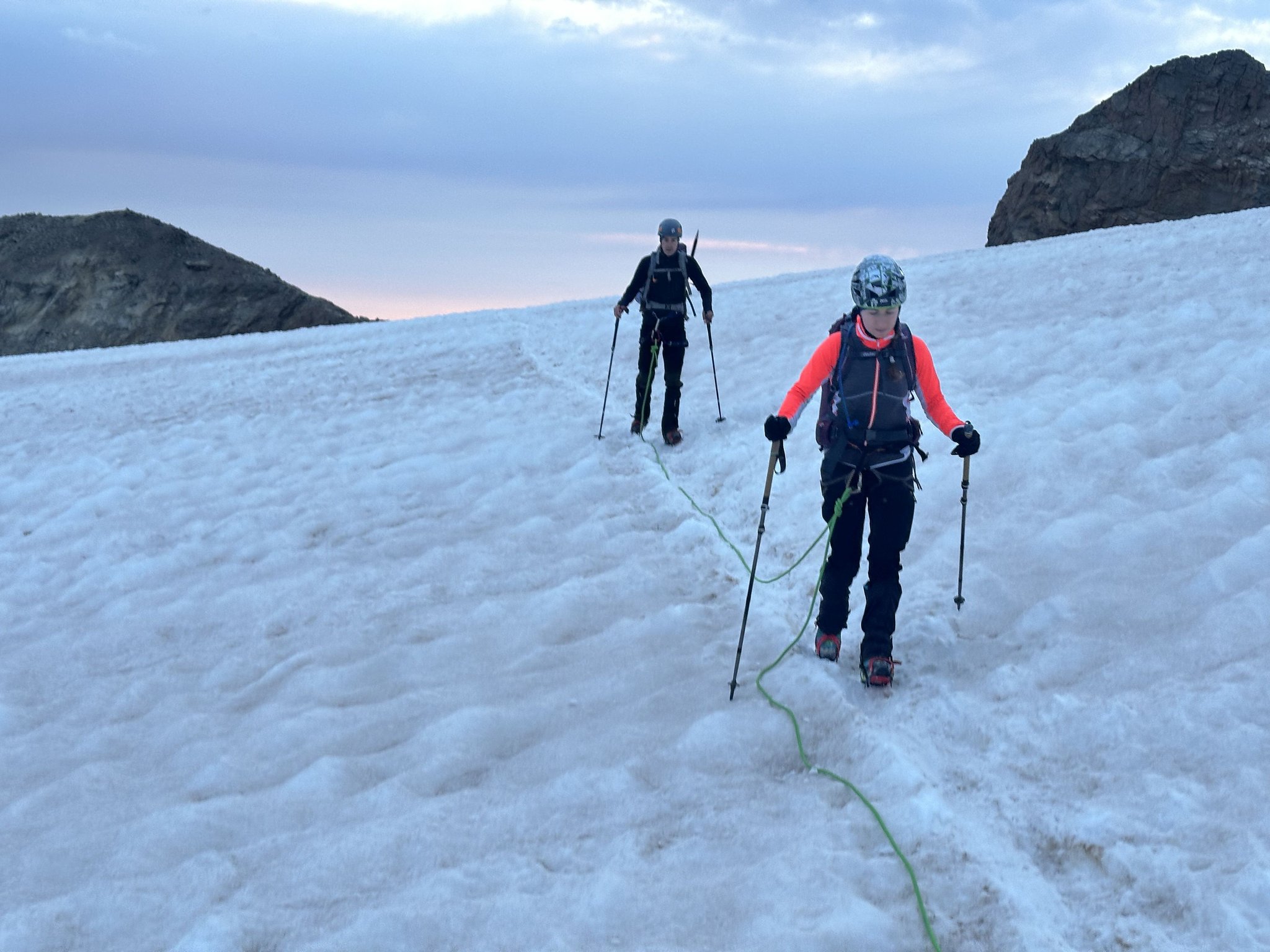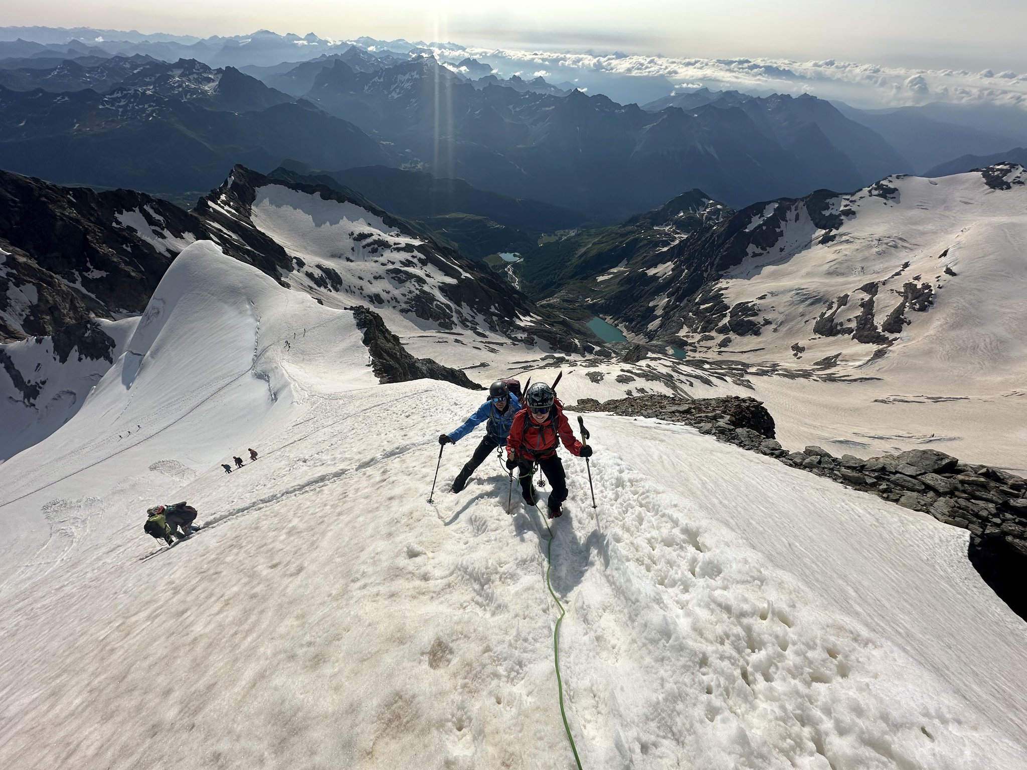 2.Tag: Am nächsten Morgen starten wir früh. Von der Diavolezza aus queren wir hinter dem Piz Trovat vorbei auf den Persgletscher. Dort seilen wir uns an und steigen zwischen eindrucksvollen Spaltenzonen sowie über teils steilere Passagen in Richtung Piz Palü auf. Vom Ostgipfel folgen wir – je nach Verhältnissen – dem luftigen Firngrat bis zum Hauptgipfel des Piz Palü.