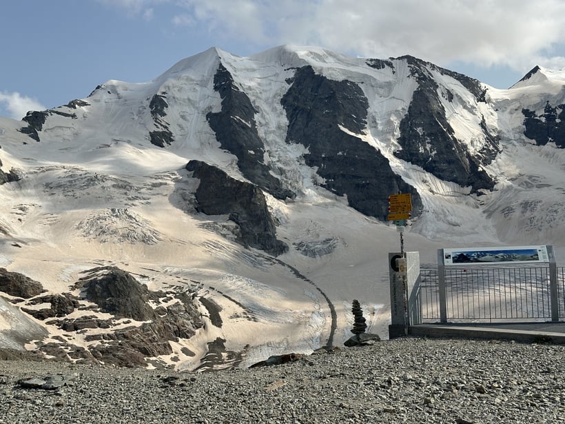 1.Tag: Wir treffen uns am Nachmittag am Parkplatz der Diavolezza-Bahn und fahren gemeinsam mit einer der letzten Seilbahnen hinauf zum Bereghotel Diavolezza, wo wir übernachten.