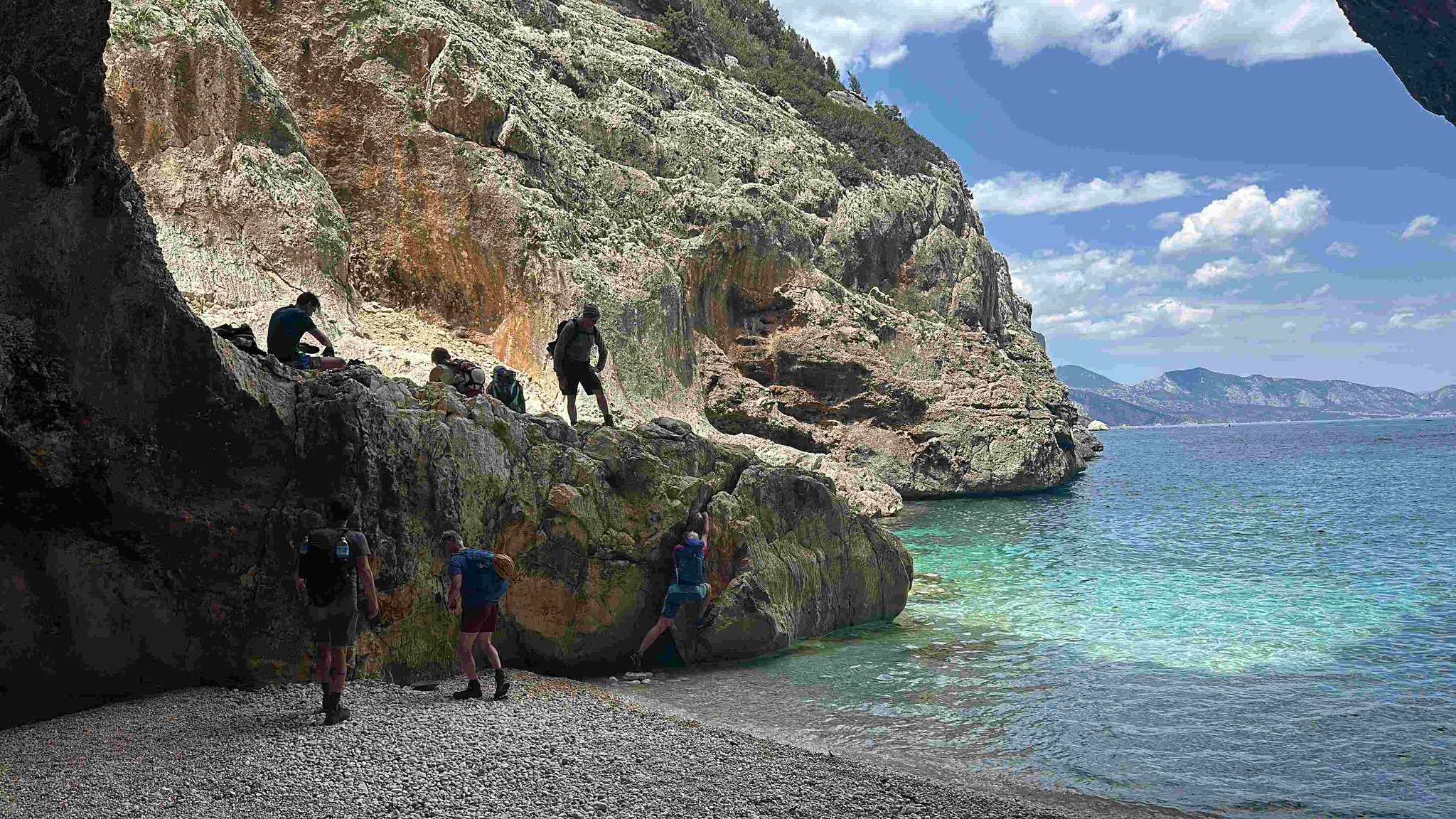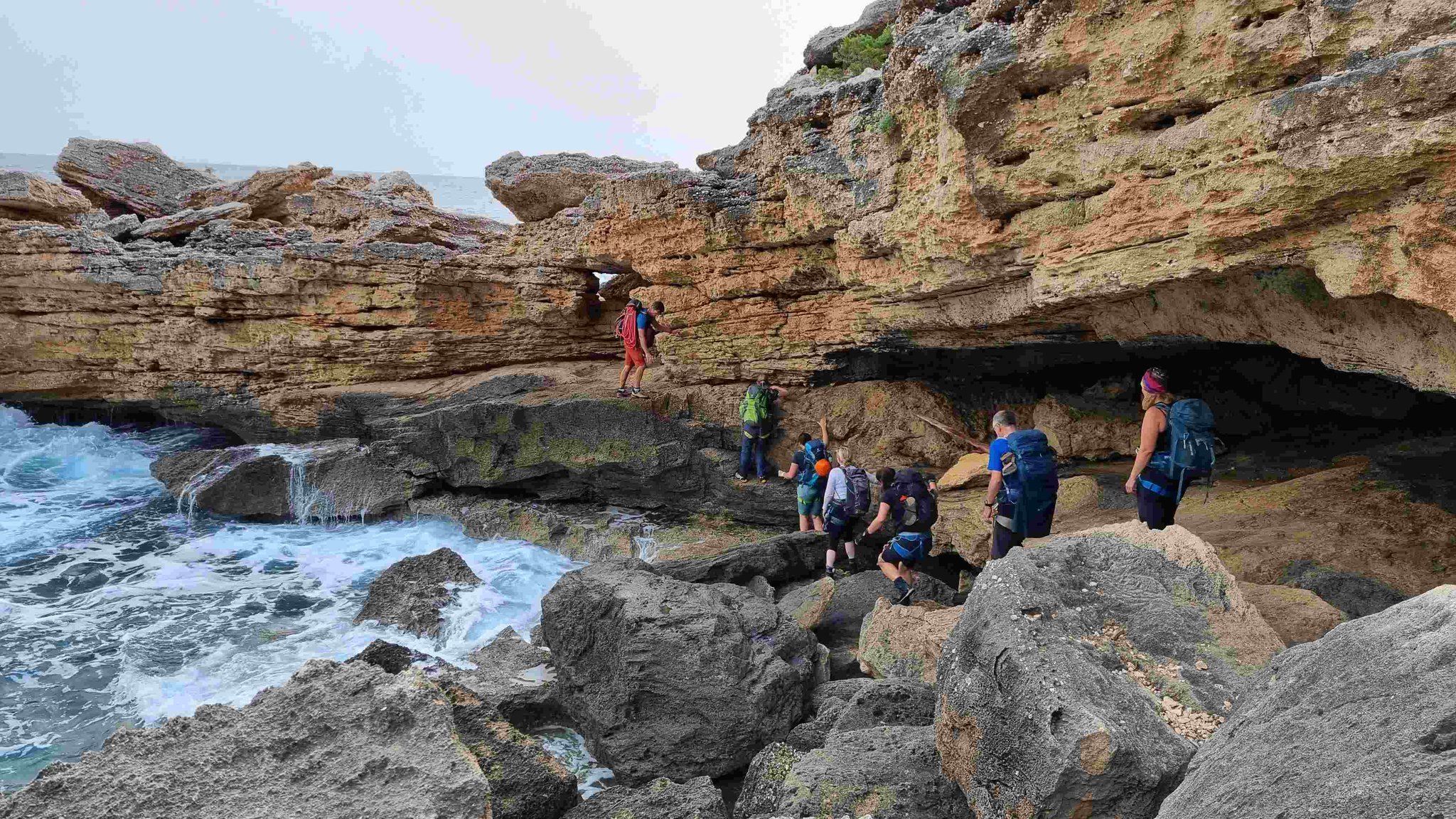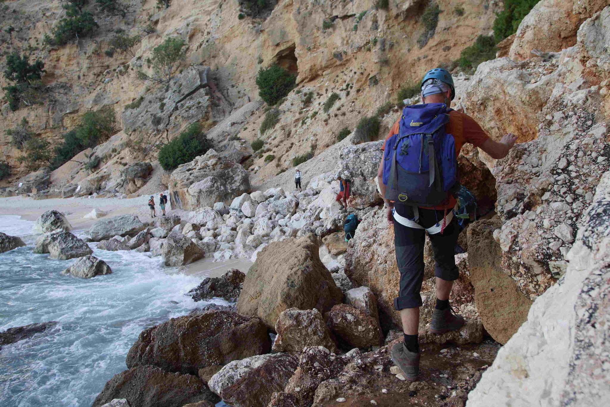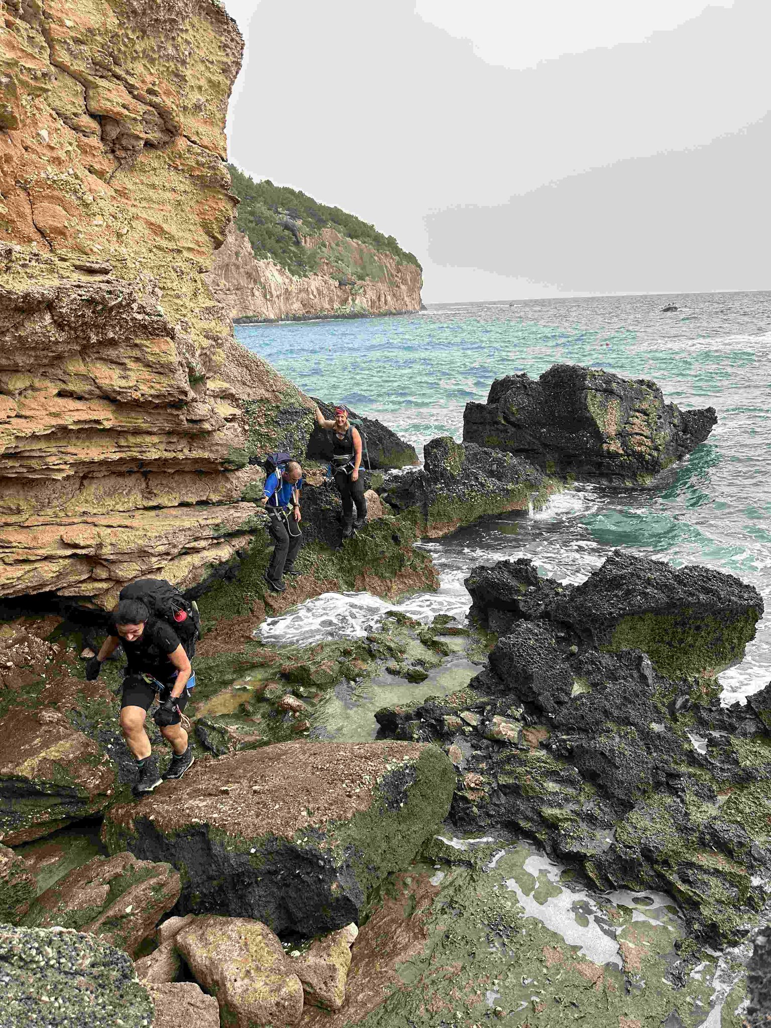 In den nächsten Tagen wandern wir entlang der Küste, mit wechselnden Anstiegen und Abstiegen, teilweise in weglosem Gelände auf ausgesetzten Felsbändern durch Schluchten und Höhlen. An manchen Passagen werden die Teilnehmer mit einem Seil abgelassen, Abseilkenntnisse sind nicht erforderlich. Zwischendurch laden einsame Badebuchten zu einem erfrischenden Bad im warmen Meer ein. Die Lagerplätze befinden sich in der Nähe von Buchten oder auf Campingplätzen mit Dusch- und Lademöglichkeiten für elektrische Geräte. Der genaue Ablauf wird vor Ort je nach Gegebenheiten festgelegt.