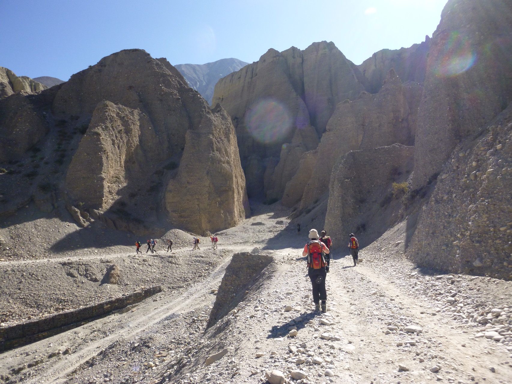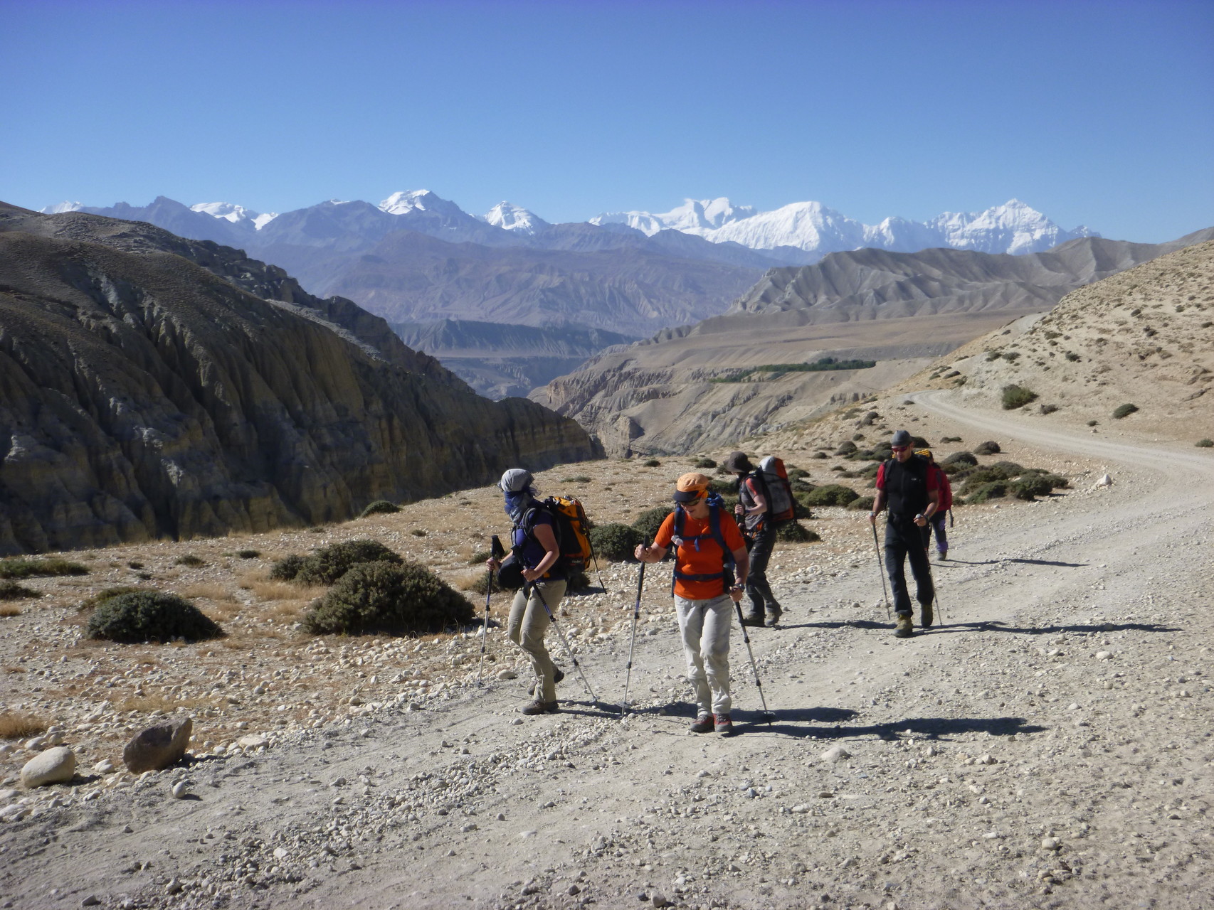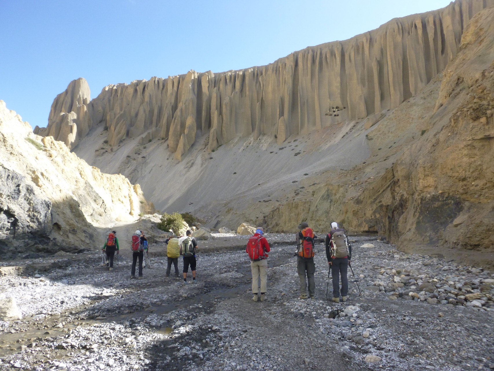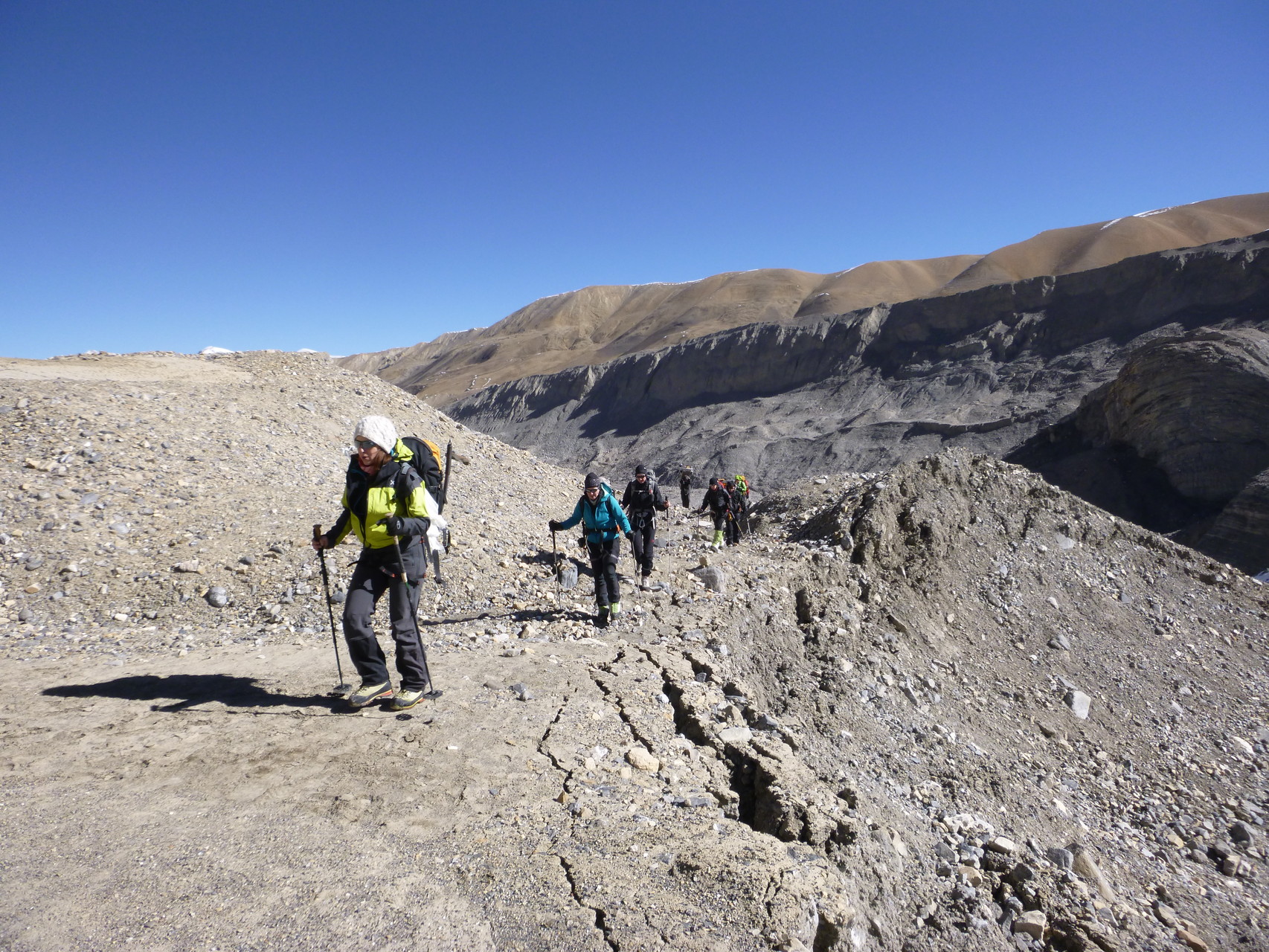 Über den Mustang Pass (6042 m) von Lo-Manthang ins Naar Phu Valley mit Seribung Peak (6328 m). Bis 1991 war das Mustang völlig isoliert. Eine allmähliche Öffnung mit strengen Besuchervorschriften hat dieses frühere „Königreich“ als absolutes Juwel unter Nepals Trekking-Gebieten erhalten. Alleine schon die Landschaftsformen und -farben mit grellorangen Felswänden, bunten Canyons und wilden Erosionsgebilden sind einen Besuch wert. Inzwischen ist es nun möglich vom Mustang Gebiet über den vergletscherten „De Hults“- bzw. Mustang-Pass ins spät geöffnete Naar Phu Tal zu kommen. Bergsteigerischer Höhepunkt dieses absolut außergewöhnlichen Trekkings ist die allmähliche Annährung an die Welt der stark vergletscherten 6000- und 7000er des Damodar-Himals. In der Hochgebirgslandschaft konnte vom Mustang-Pass der Seribung Peak (6328 m) bestiegen werden.