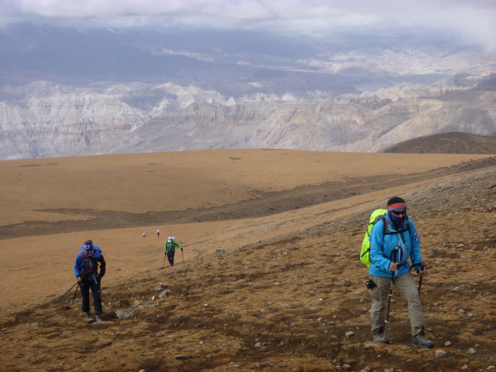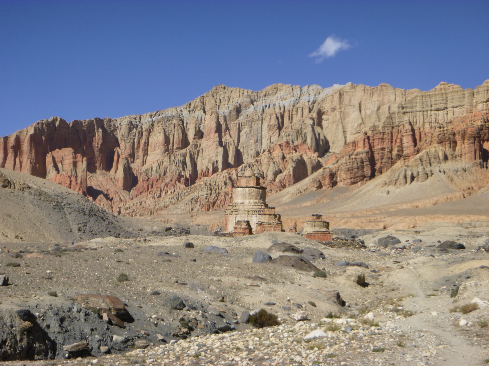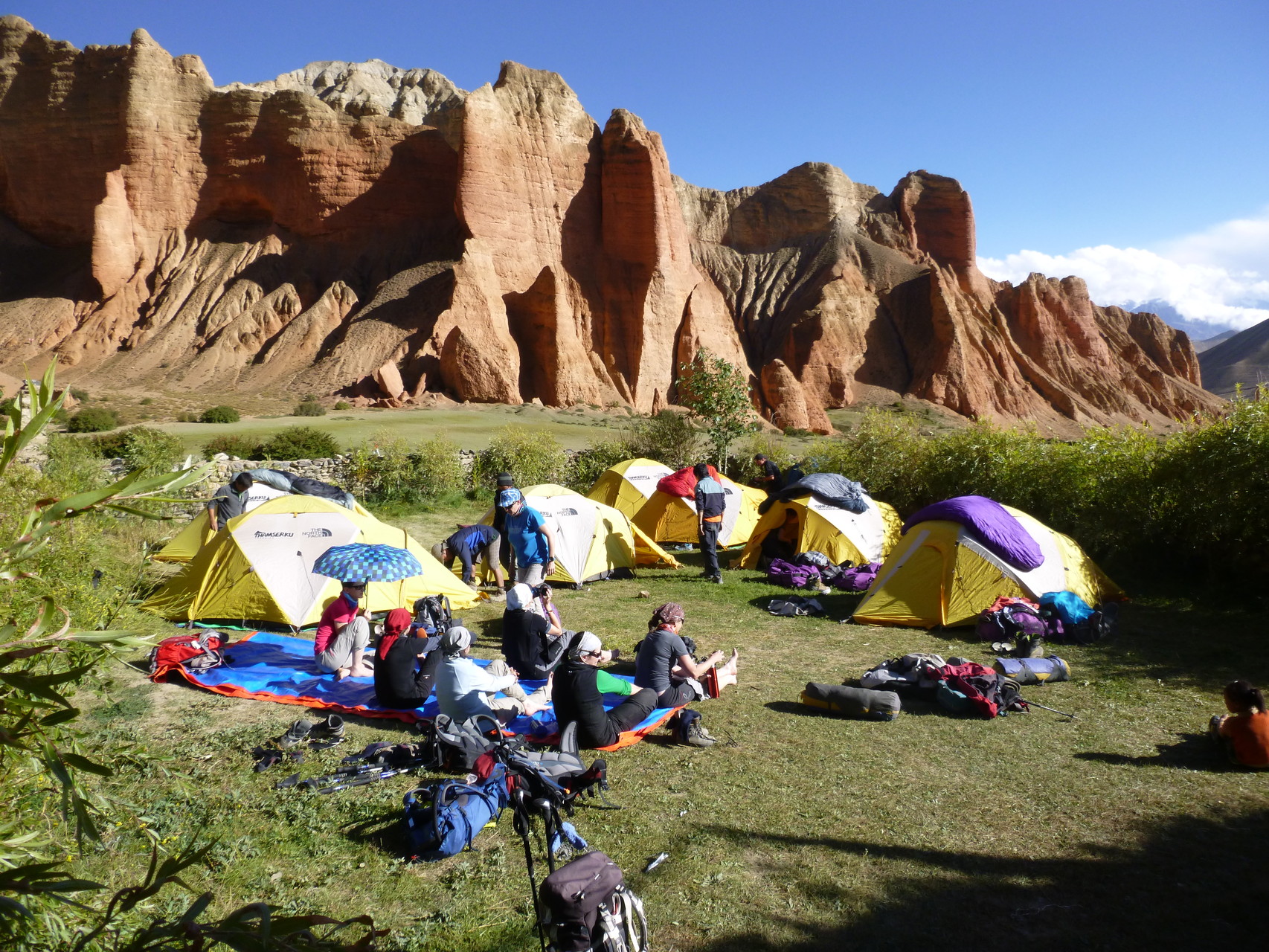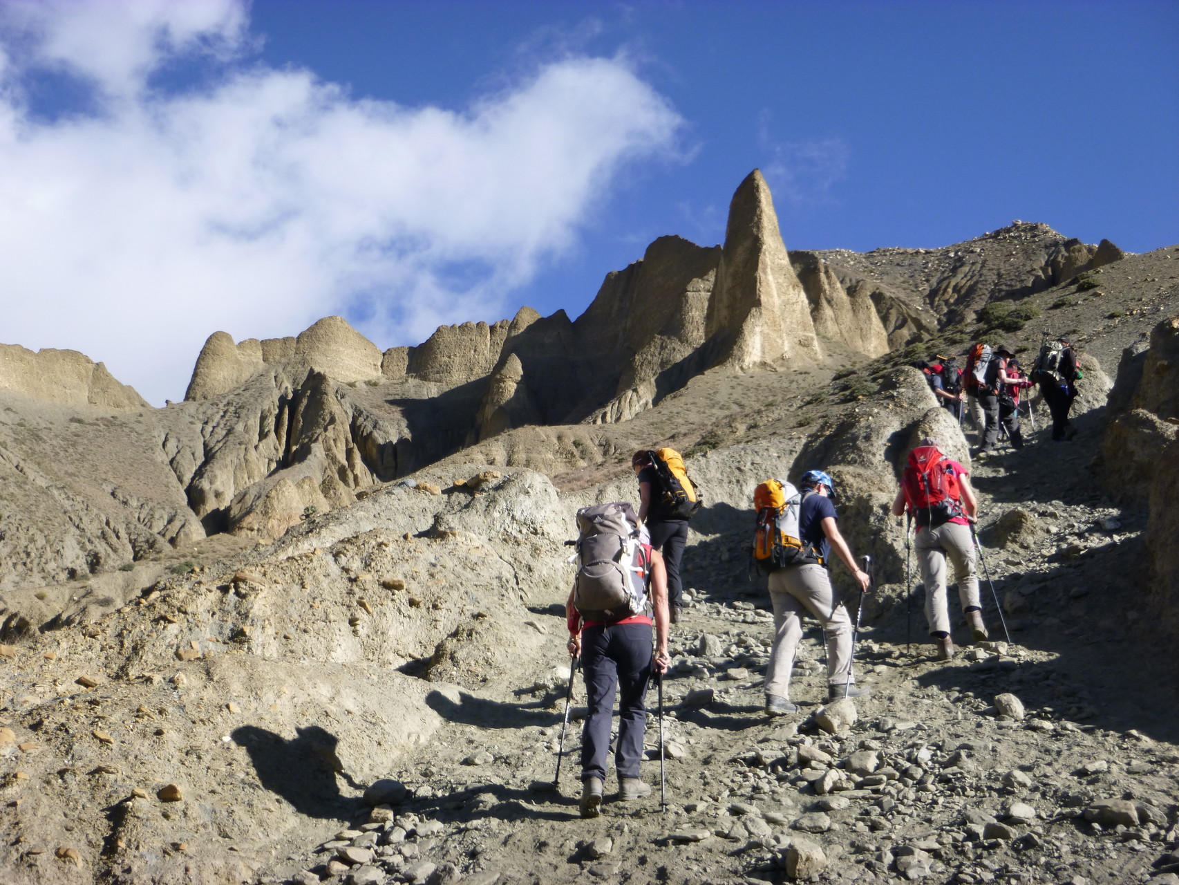 Über den Mustang Pass (6042 m) von Lo-Manthang ins Naar Phu Valley mit Seribung Peak (6328 m). Bis 1991 war das Mustang völlig isoliert. Eine allmähliche Öffnung mit strengen Besuchervorschriften hat dieses frühere „Königreich“ als absolutes Juwel unter Nepals Trekking-Gebieten erhalten. Alleine schon die Landschaftsformen und -farben mit grellorangen Felswänden, bunten Canyons und wilden Erosionsgebilden sind einen Besuch wert. Inzwischen ist es nun möglich vom Mustang Gebiet über den vergletscherten „De Hults“- bzw. Mustang-Pass ins spät geöffnete Naar Phu Tal zu kommen. Bergsteigerischer Höhepunkt dieses absolut außergewöhnlichen Trekkings ist die allmähliche Annährung an die Welt der stark vergletscherten 6000- und 7000er des Damodar-Himals. In der Hochgebirgslandschaft konnte vom Mustang-Pass der Seribung Peak (6328 m) bestiegen werden.