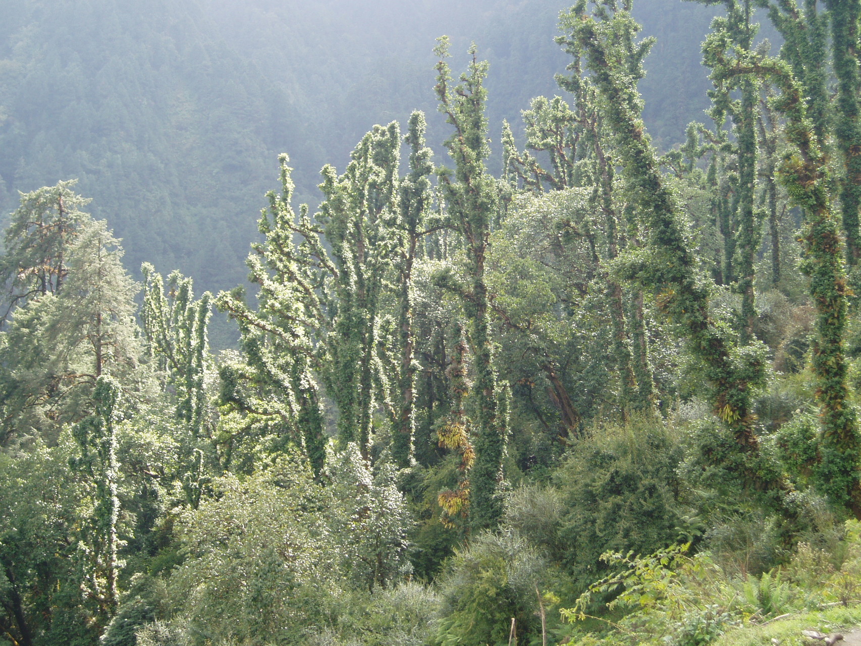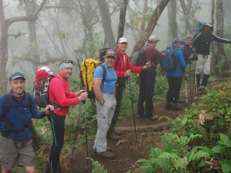 12.Sept. 2008 - Durch Regenwald führt die erste Etappe in 5 Stunden hoch zum Machame Camp, 3.000 m. Mit uns ein 48-köpfiges Team aus Guides, Köchen und Trägern.