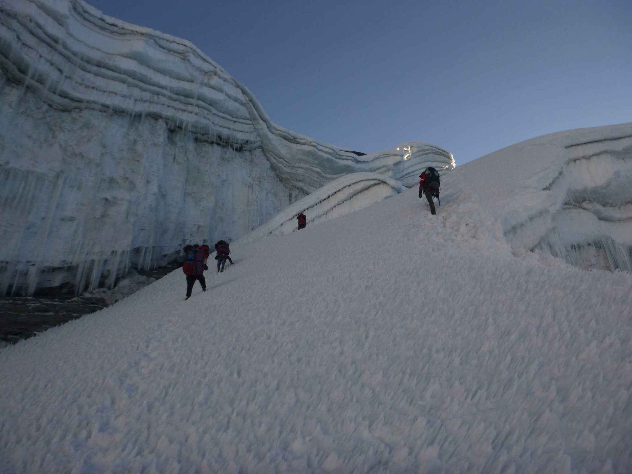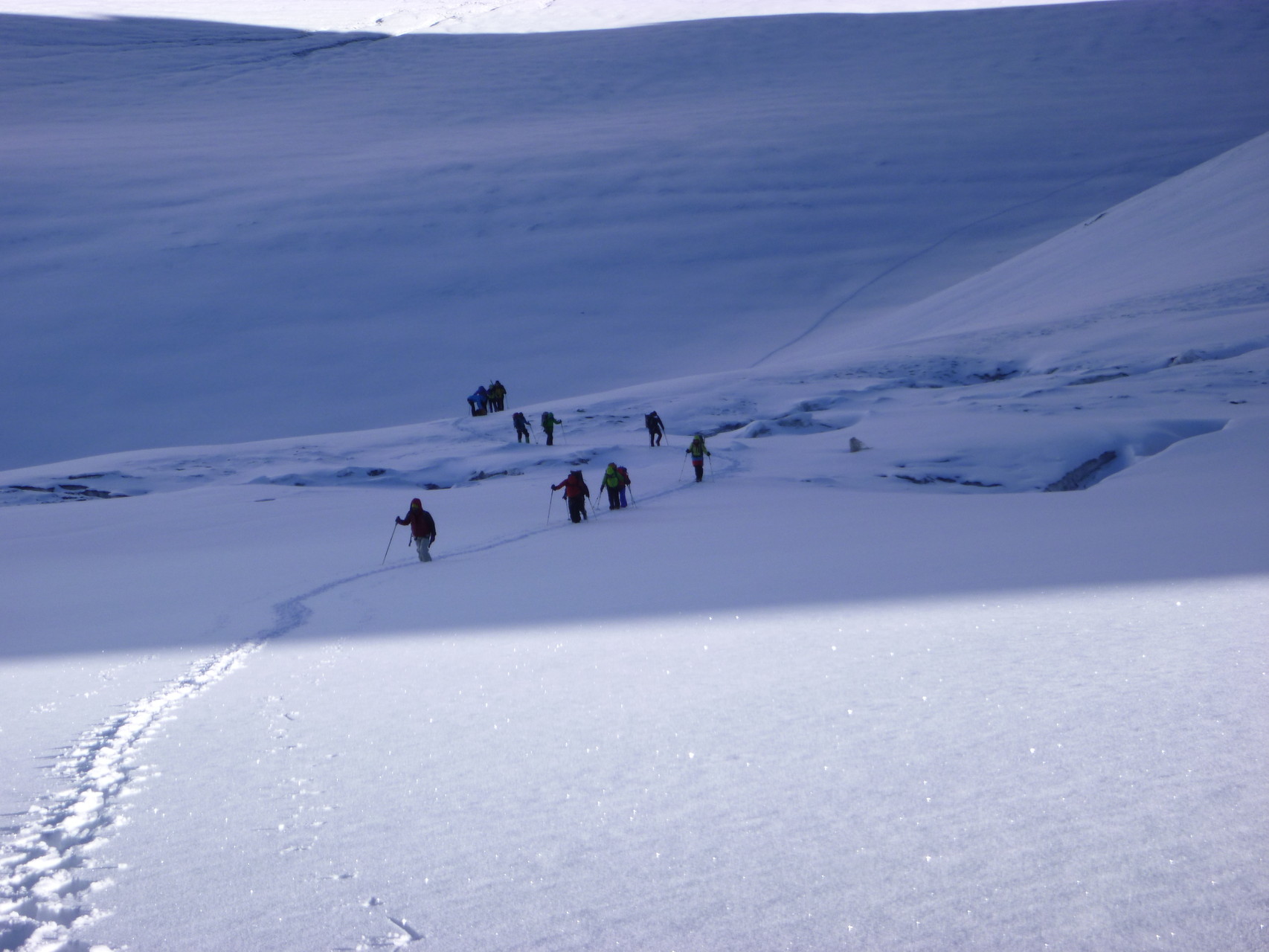 Zwar sind die Flanken kaum steiler als 25 Grad - trotzdem kann dies bei Blankeis auch gefährlich und anstrengend sein.